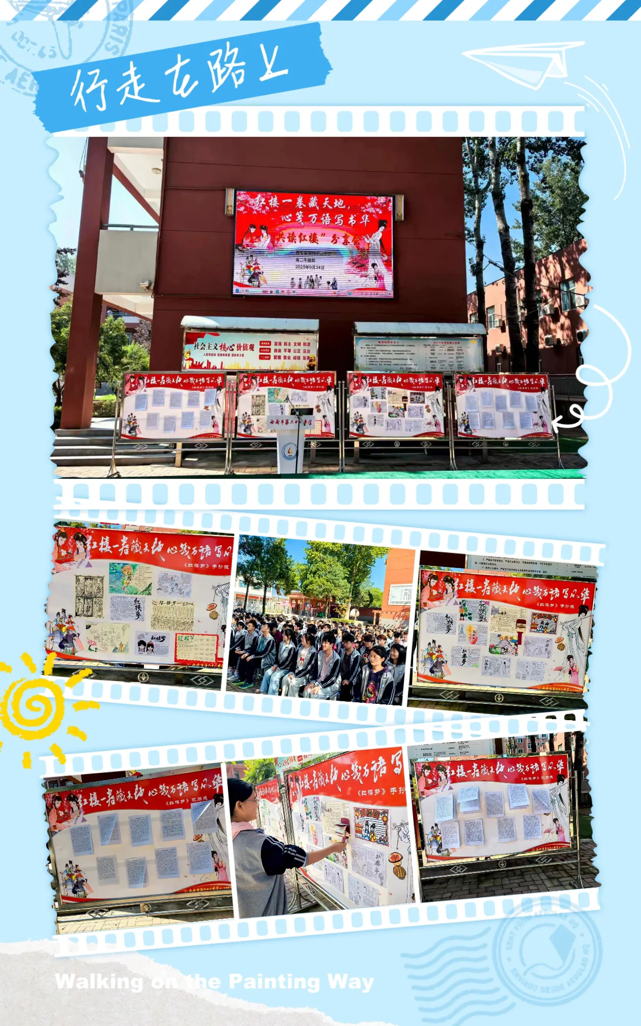 活动伊始,高二年级年级组长王苗老师上台介绍了活动背景:自上学期初起,高二年级师生坚持每周三开展《红楼梦》共读活动,旨在通过持续阅读感受经典魅力。本次活动分为"红楼手抄报与读后感展示"及"师生读红楼分享交流会"两大板块,随后两位小主持人介绍了参会领导,并宣布活动正式开始。