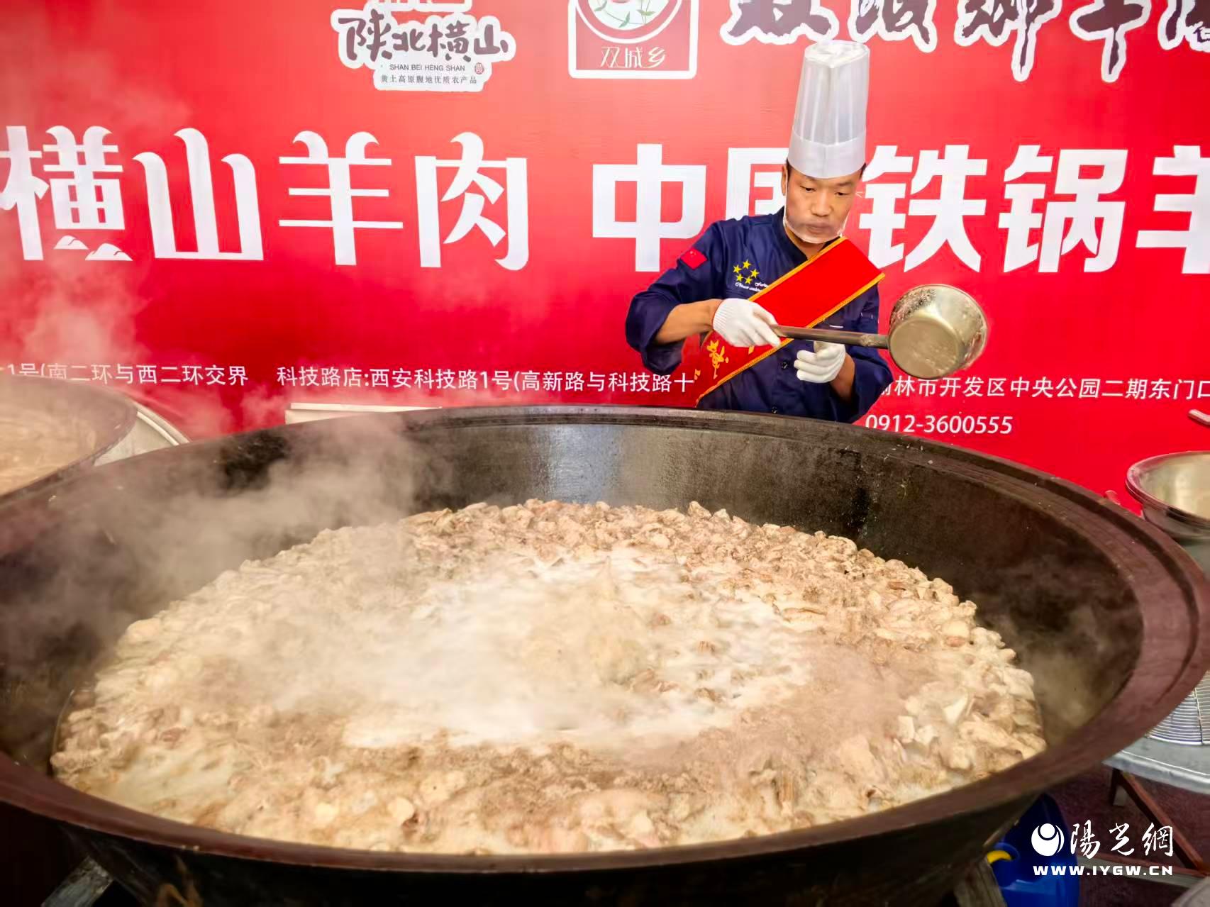 博览会上,双城乡羊肉现场用铁锅炖起来,凉水下锅、翻煮、下料,地道的横山羊肉香扑面而来。