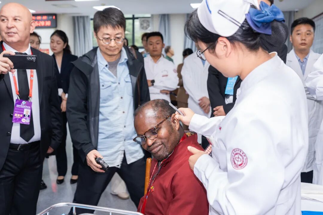 在骨伤科中医综合治疗区,国外嘉宾观摩了推拿、牵引、火疗、中药竹罐、温灸刮痧、耳穴压豆等中医适宜技术。马里中医鲁班工坊迪亚拉博士体验推拿手法后表示:“我这次坐了20多个小时的飞机,肩膀又酸又痛,现在感觉舒缓多了。确实如同旁边的阿姨所说,这是中国传承千年的技艺,不但舒服,还能治病!”