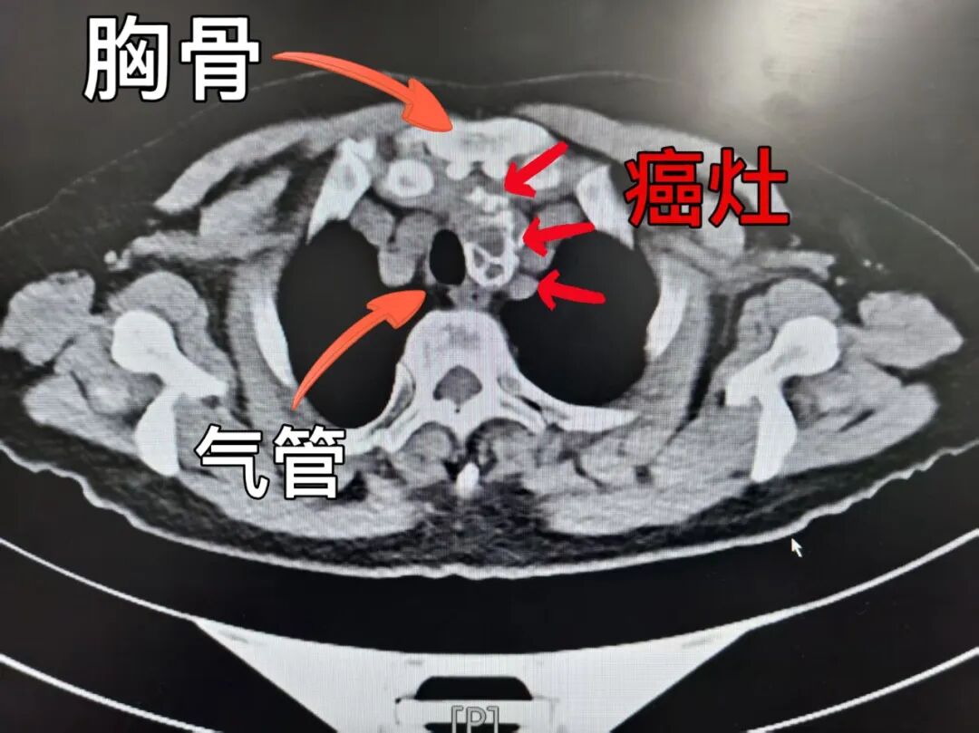 此后,王阿姨跑遍了省内好几家医院,穿刺后确诊甲状腺乳头状癌复发,且肿瘤位置异常凶险,大部分隐匿于胸骨后方,同时伴有侧颈部淋巴结转移。由于首次手术后颈部形成严重瘢痕,导致解剖结构紊乱不清,加之肿瘤深入胸腔,手术可能需要劈开胸骨,各大医院都以“手术难度大、风险高”拒绝了她。