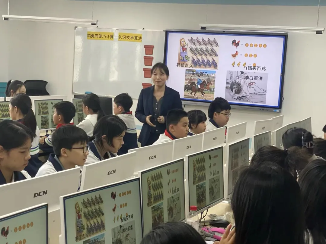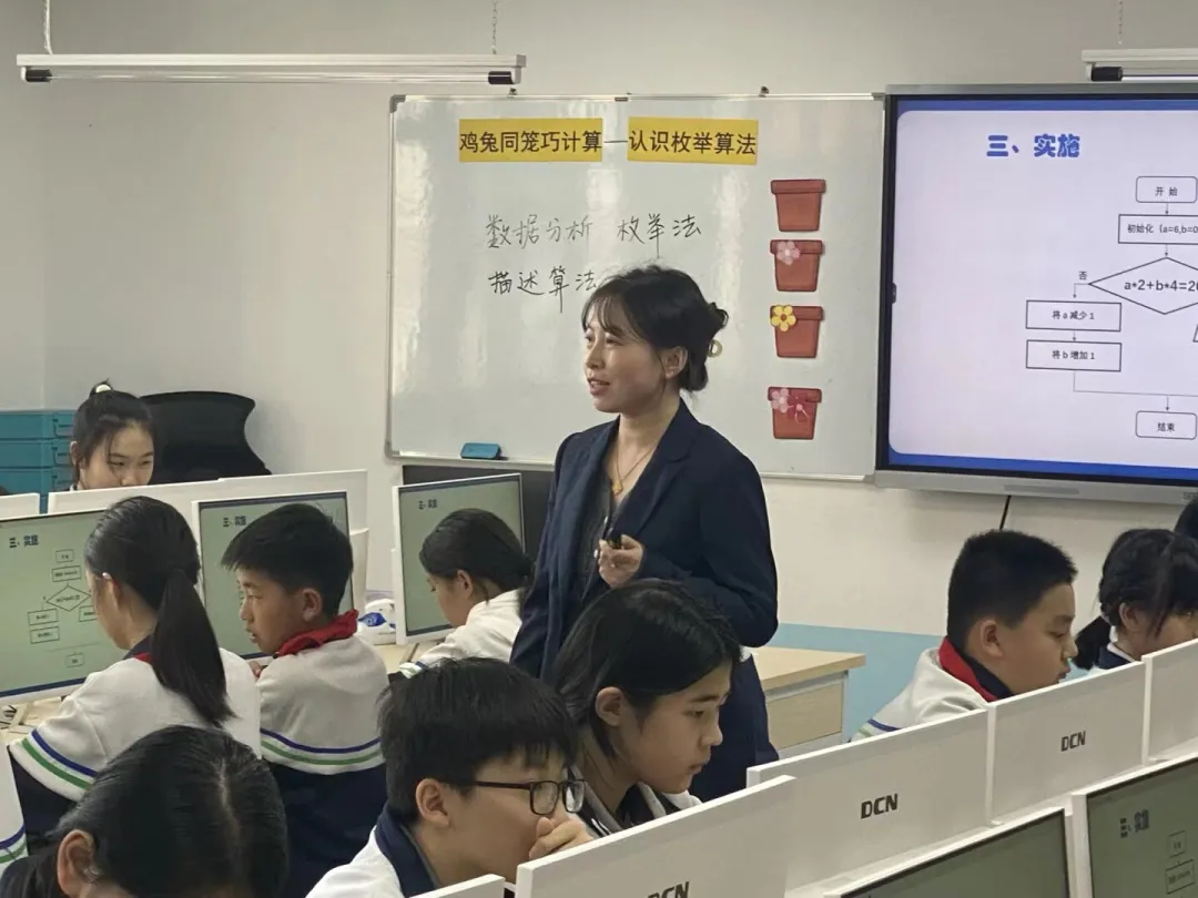张瑶老师讲授的内容出自信息科技新课程标准中第三学段《身边的算法》。张老师结合学生学情,设计课例《鸡兔同笼巧计算——认识枚举算法》。课堂开始,张老师巧用《孙子算经》中的鸡兔同笼问题导入,引发学生好奇和求索的兴趣,随后,引导学生将鸡兔同笼所有的可能性列举出来,让学生初步认识枚举算法,随着数据量的增大,张老师带领同学们通过计算机编写的程序,实现了大数据量的快速运算。