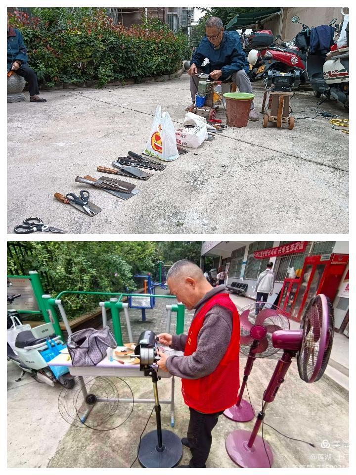 人气最高的要数磨刀区,磨刀师傅刚“出摊”,居民们纷纷前来,需要磨的刀和剪排成长长一列,磨刀师傅手工专注地打磨着每一把刀,不一会儿,一把把锋利的刀具就呈现在居民眼前。家电维修师傅,对前来维修的风扇,经过拆解、检测工作、维修,原本不能运转的风扇转起来了。李阿姨高兴地说:“我身体不能受凉,夏天就爱用风扇,这下风扇修好了,省的我花钱买新的,明年继续用这风扇!”