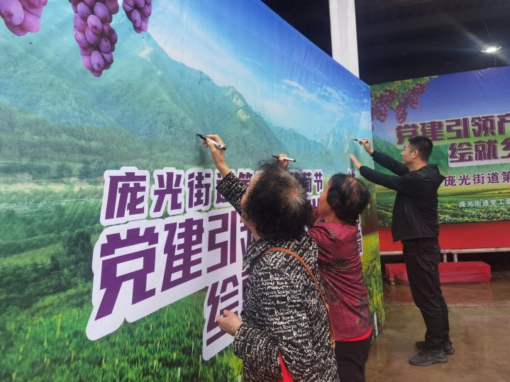 为热烈庆祝第八个中国农民丰收节,集中展示高新区乡村振兴与现代农业发展成果,进一步提升“庞光葡萄”等农产品的品牌影响力,9月23日上午,西安高新区庞光街道成功举办庆祝中国农民丰收节暨第二届葡萄节活动。高新区农业农村和水务局、庞光街办相关负责人、各村(社区)干部、第一书记、驻村工作队、乡村振兴顾问、街办各科室干部代表、驻村指导员、辖区葡萄种植户和群众代表等80余人参加。
