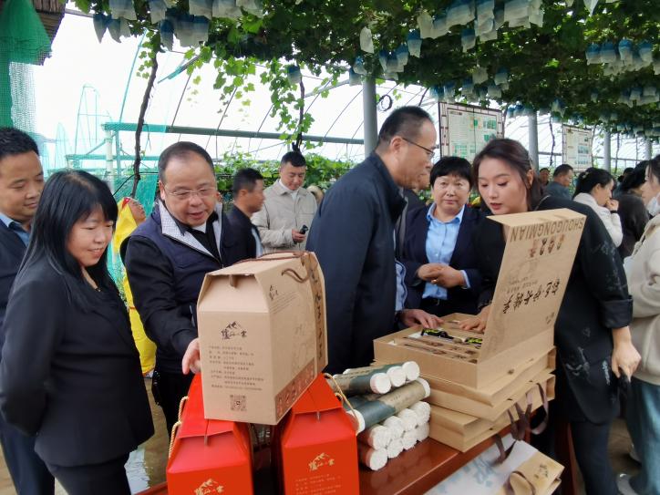 活动现场设有多个农产品展示品鉴区。“户太八号”“阳光玫瑰”等优质葡萄品种色泽诱人、果香浓郁,吸引众多群众驻足品尝。炉丹手工泉水挂面、天丰香醋等本地特色农副产品也同步展出,全面呈现了庞光街道在推动农业提质增效、打造特色产业方面取得的扎实成效。