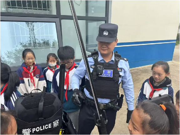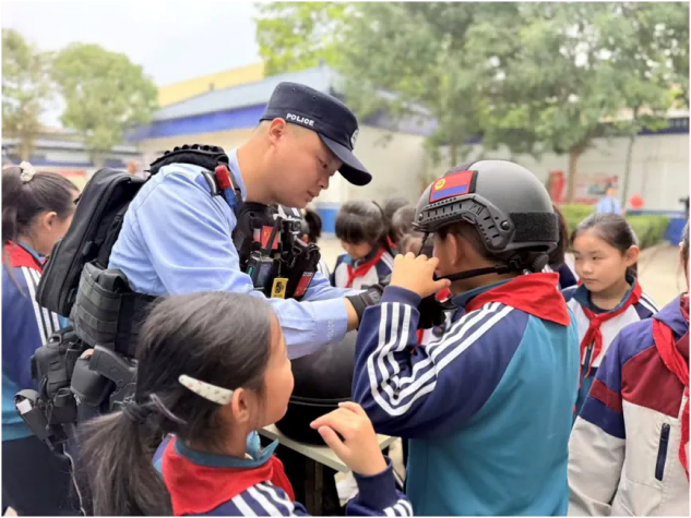 在警用装备展示环节,瞬间点燃了孩子们的好奇心。民警将防暴头盔、防弹头盔、各类盾牌、单警装备、防刺背心、防割手套、手铐等警械整齐摆放,一边演示装备的使用方法,一边讲解不同装备的适用场景。“这顶防爆头盔能抵御多大的冲击力?”“防刺背心真的能挡住尖锐物品吗?”面对孩子们的提问,民警辅警耐心解答,还邀请部分同学在指导下尝试穿戴装备,亲身感受警械背后的责任与安全保障,现场互动氛围热烈。