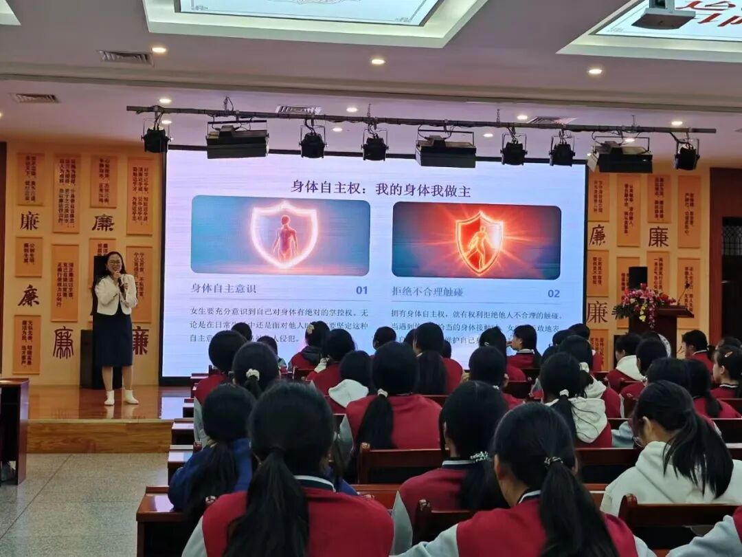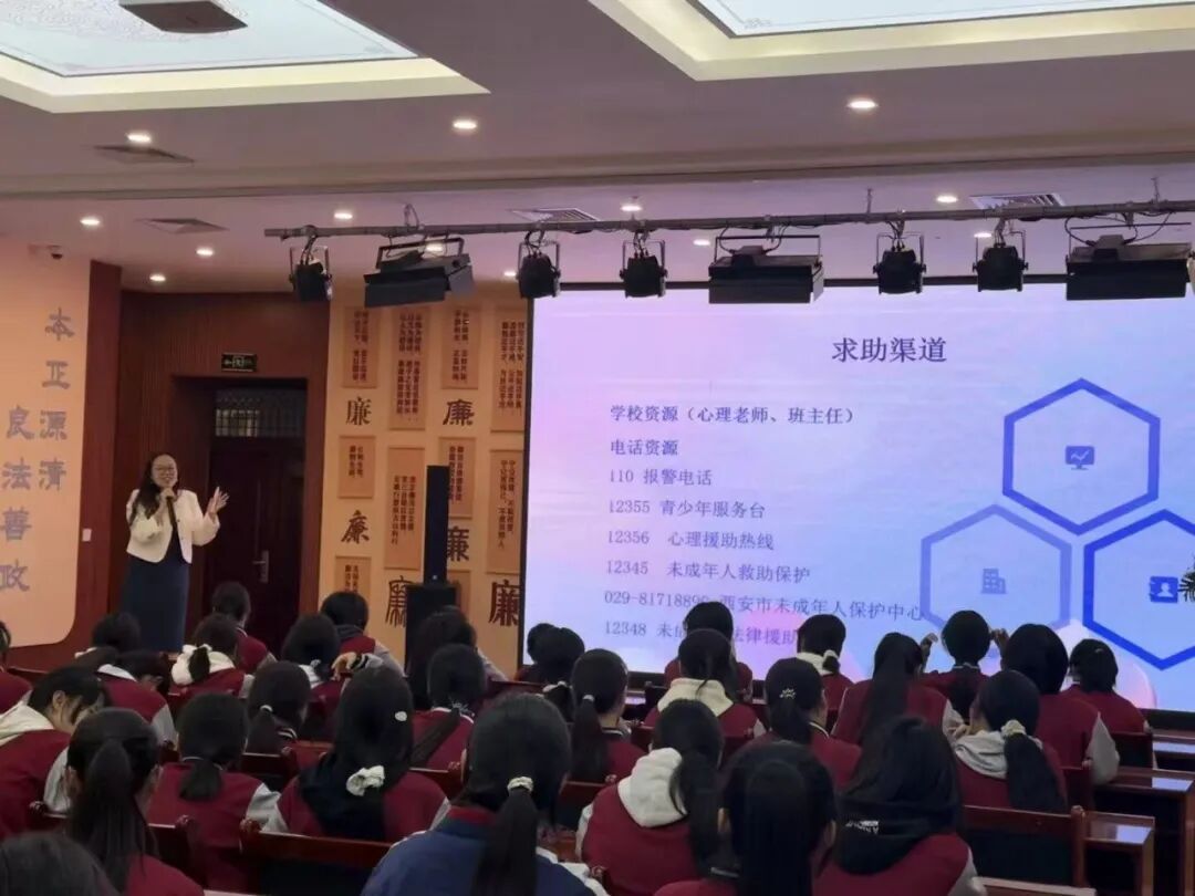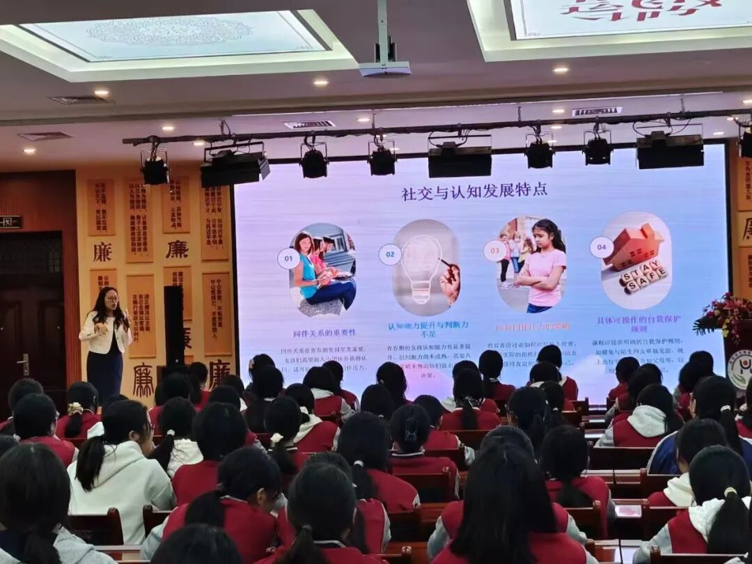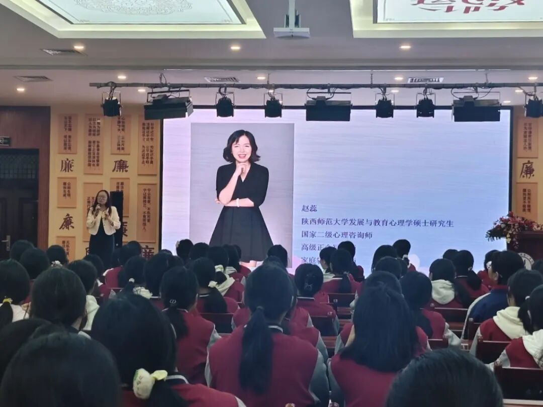 2025年9月23日,西安市汉都第一学校以“守护青春,赋能成长”为主题的八年级女生心理健康专题培训在学校多功能厅温情举行。本次培训特邀陕西师范大学发展与教育心理学硕士研究生赵蕊老师担任主讲,旨在为正处于身心发展关键期的八年级女生提供专业心理指导,帮助她们更好地认识自我、应对挑战、健康成长。