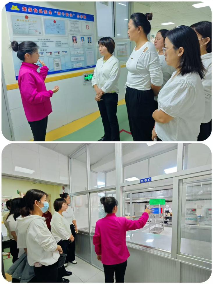 食品安全管理员曹睿老师带领膳食监督委员会成员参观食堂区域,并讲解食堂操作间、原料库、配餐间、粗加工间、清洗间、消毒室等专间的设备设施配备及管理使用情况。