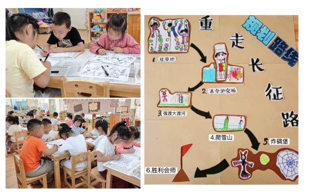 大班的金宝们为“重走长征路”认真筹备。他们执笔画纸,认真勾勒游戏计划的模样,每一笔都是对那段红色征程的好奇,每一幅画都是他们对“长征”游戏的满心期待。