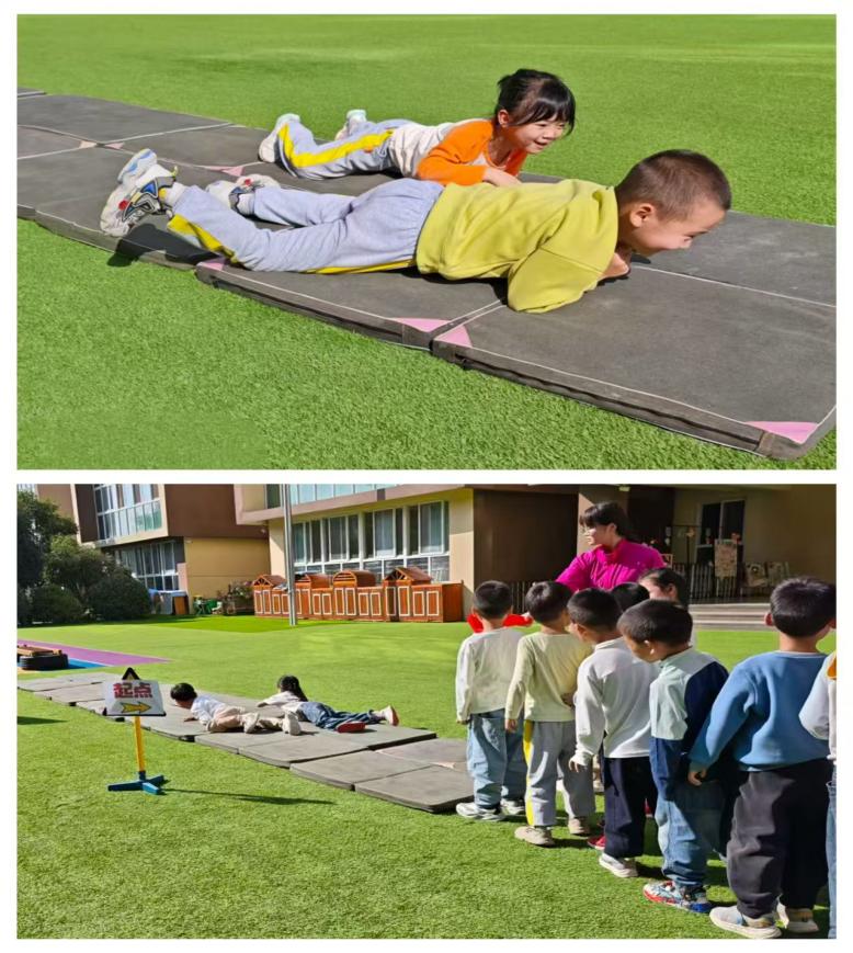 金宝们在匍匐拉绳的过程中,就像红军在赤水河畔灵活作战、相互支援,小小的身影在软垫上书写着“团结就是力量”