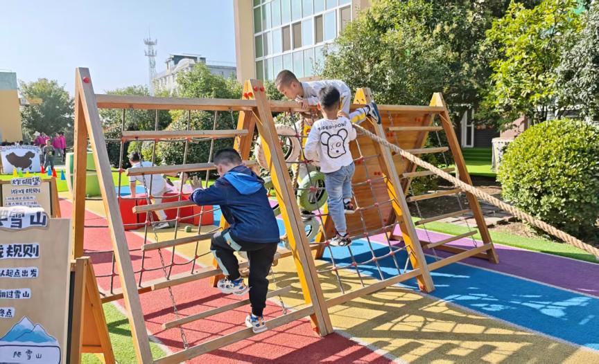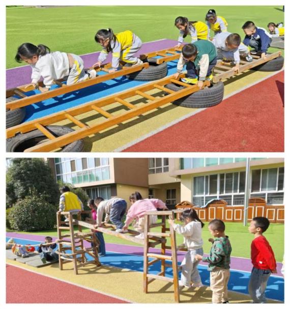 木质攀爬架是金宝们眼中的“皑皑雪山”。他们手脚并用,努力翻越“雪山”,哪怕中途想放弃,也会在同伴的鼓励和自己的坚持下继续向上,这正是长征中“坚韧不拔”精神的生动缩影。