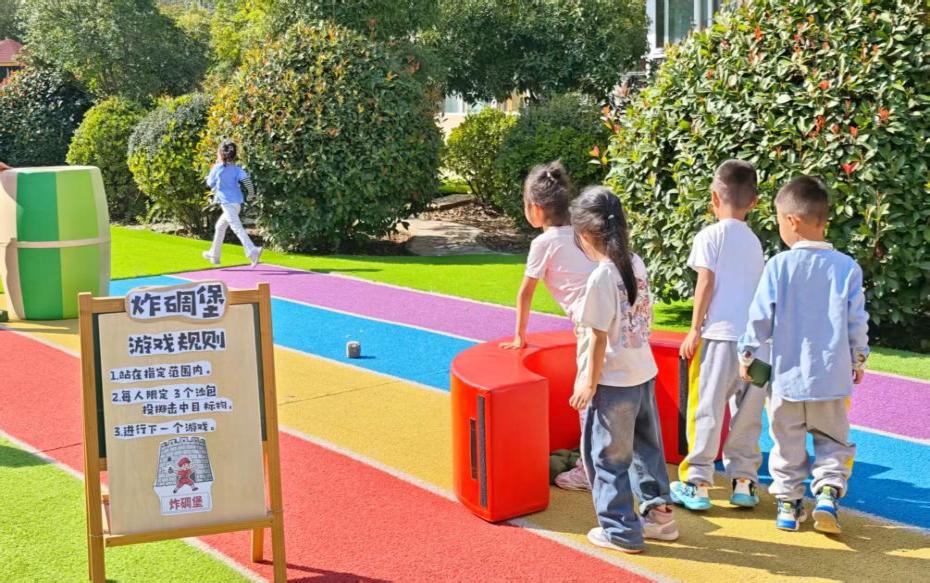 “炸碉堡”环节,金宝们站在指定区域,瞄准“碉堡”投掷沙包。每一次瞄准、每一次投掷,都是对“精准”与“勇气”的试炼,就像红军战士攻克碉堡时的果断与智慧,金宝们在游戏中体验“使命必达”的成就感。