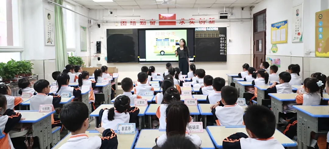 活动伊始,杜苗老师走进课堂,利用图文并茂的多媒体课件,为同学们带来了一堂生动而深刻的垃圾分类知识课。课件内容系统全面,从“为何要垃圾分类”到“如何区分四类生活垃圾”,深入浅出地进行讲解。她不仅清晰阐述了可回收物、厨余垃圾、有害垃圾和其他垃圾的定义与范畴,还结合生活中的常见物品,如废旧电池、过期药品、塑料瓶、果皮菜叶等,进行了详实的举例说明。课堂上,杜老师不时地与同学们互动提问,引导大家积极思考、踊跃发言,在答疑解惑中深化了理解,将垃圾分类的种子精准地播撒到每位同学的心田,为他们后续的实践行动奠定了坚实的认知基础。