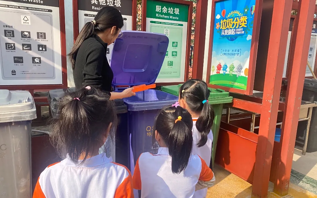 为了将课堂上学到的知识转化为实际行动能力,讲课结束后,班主任带领同学们来到校园内设置的分类垃圾桶站点前,开展了“垃圾找家”实地教学。班主任首先引导大家仔细观察不同颜色垃圾桶的标识与文字,重温了蓝、绿、红、灰四种颜色分别对应的垃圾类别。接着,老师拿出提前准备好的各种实物或卡片道具,如废纸张、矿泉水瓶、鸡蛋壳、废旧荧光灯管等,邀请同学们上前进行模拟投放。面对这些容易混淆的生活实例,同学们热烈讨论,在班主任的耐心指导下,最终为每一样“垃圾”都准确找到了它们的“家”。这种寓教于乐的实践方式,不仅让抽象的垃圾分类知识变得直观可感,更在亲手操作中加深了记忆,极大地激发了同学们的参与热情。
