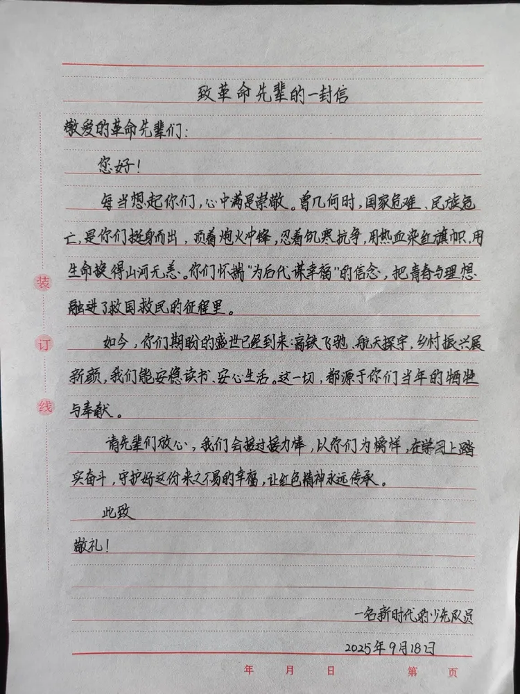 在历史发展的长河里,中华民族优秀儿女在创造辉煌历史的进程中,不断培育、积累和形成了伟大的民族精神,也留存、积淀了许许多多可歌可泣的革命历史。学生观看一部自己喜欢的红色影片,在光影的世界里感受革命先烈的英勇和无畏,并写下自己的感想,回信给革命先烈。