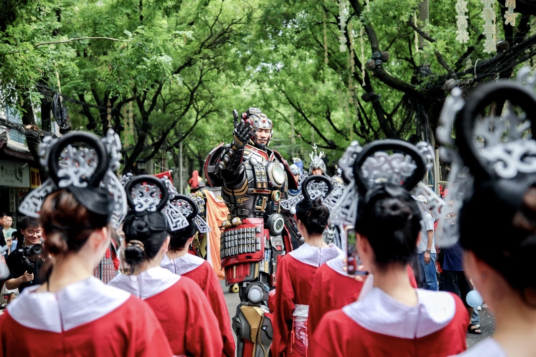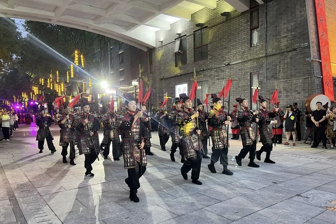 内容介绍:身着秦俑战甲的舞者组成巡游方阵缓缓前行,带领观众领略从60年代至00年代的时代变迁,展现秦人坚韧不拔、勇往直前的精神风貌。