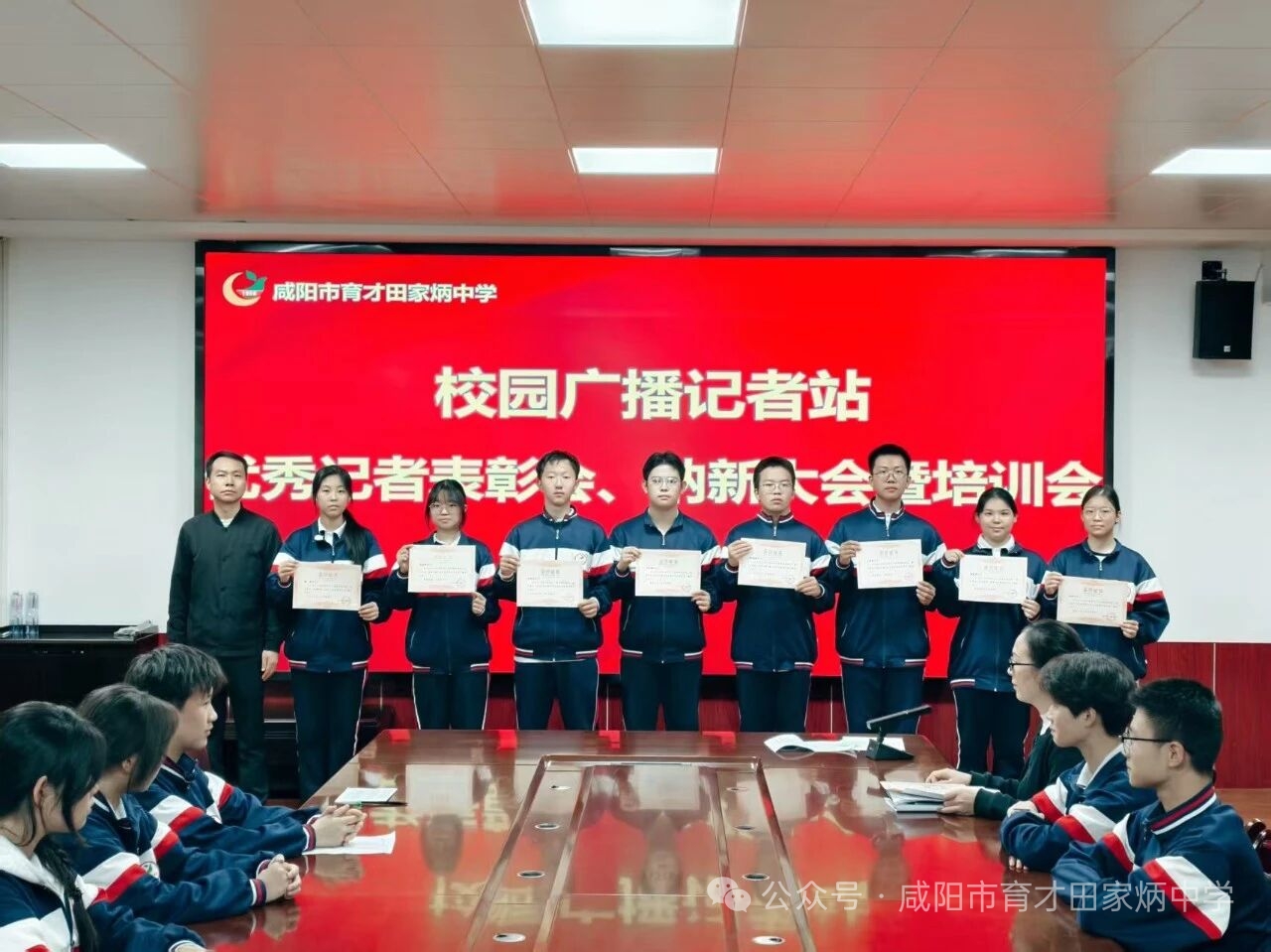 副校长张宁为上学期表现突出的优秀记者逐一颁发荣誉证书,高度肯定他们 “以笔尖捕捉校园瞬间、用声音传递青春温度” 的辛勤付出,台下响起持续掌声。