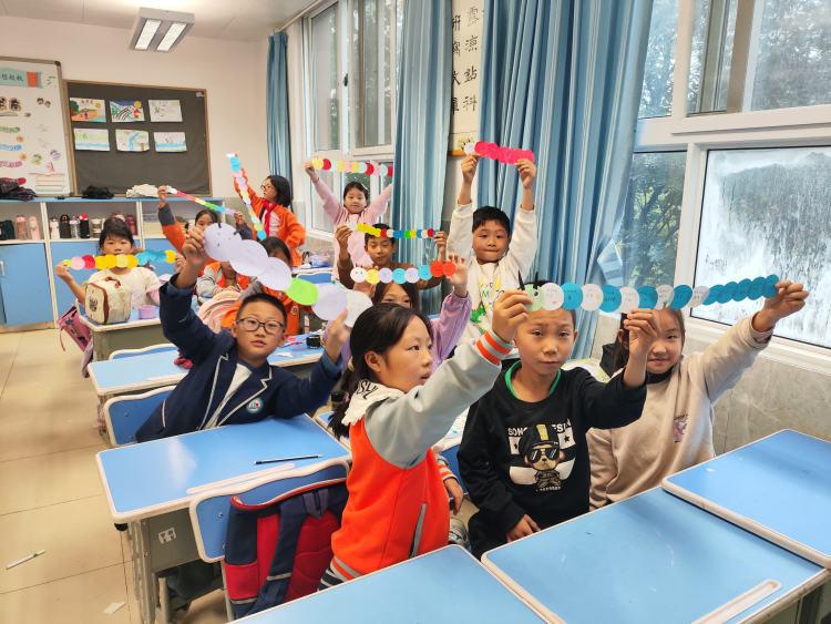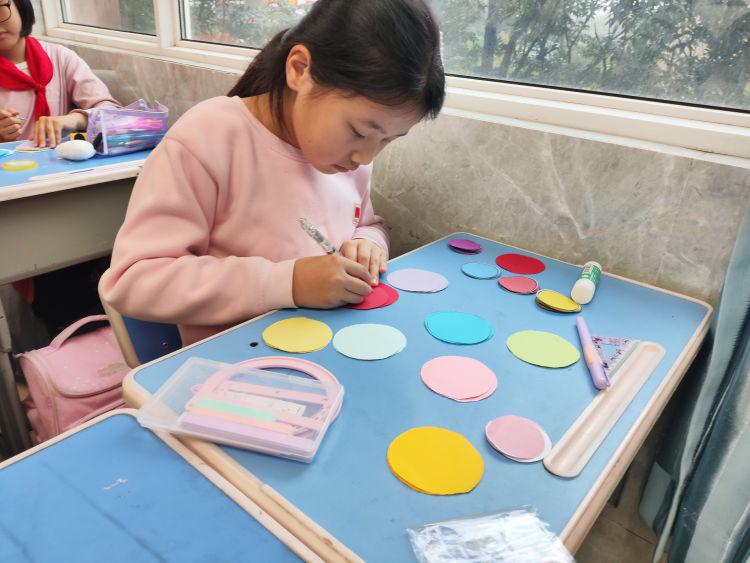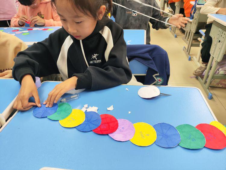 “圆片就是毛毛虫的身体节,大家可以先给‘身体’穿花衣哦!”老师话音刚落,学生们就拿起荧光笔,有的画小爱心,有的画波浪线,彩色圆片很快变得亮晶晶的。