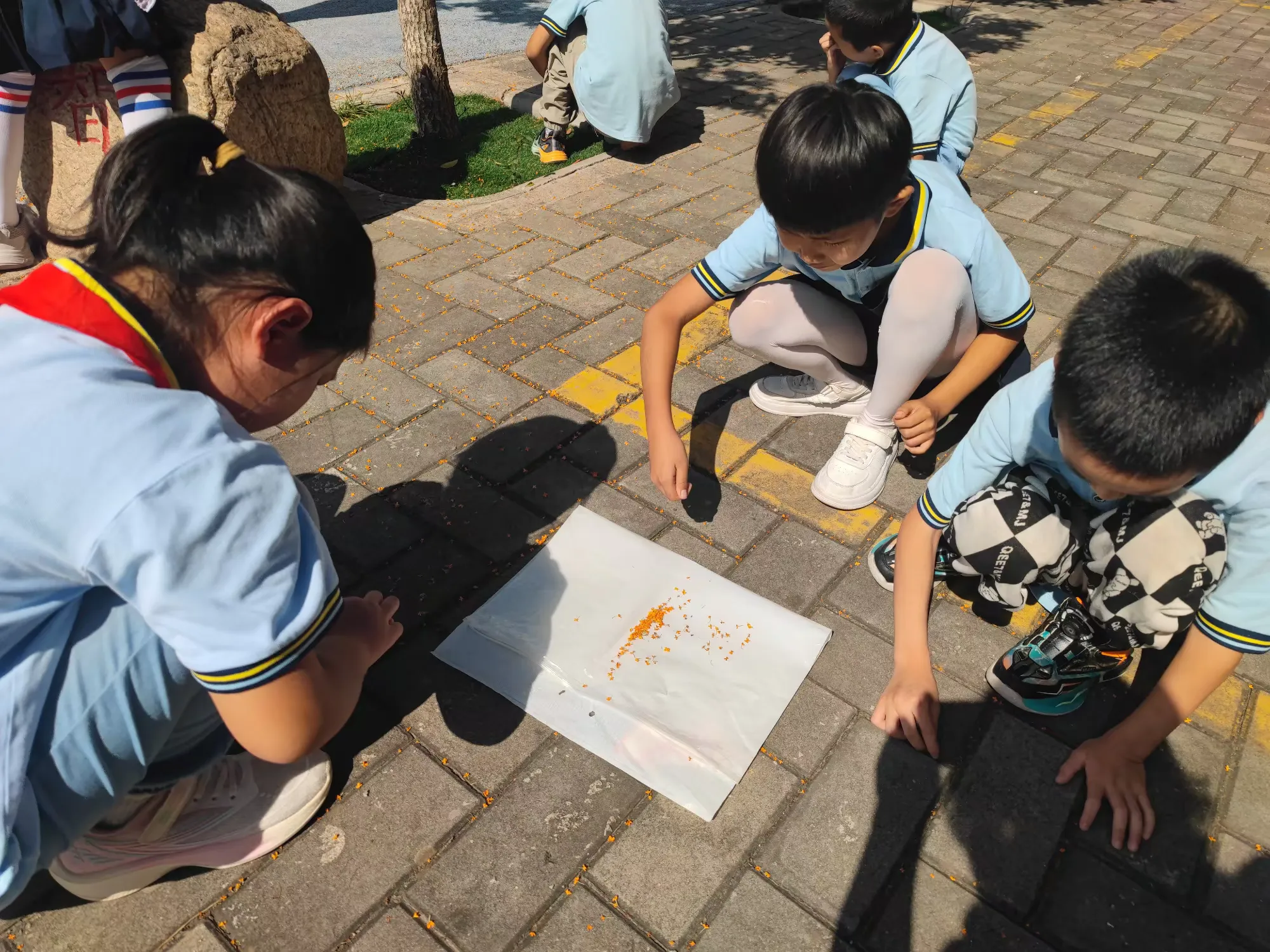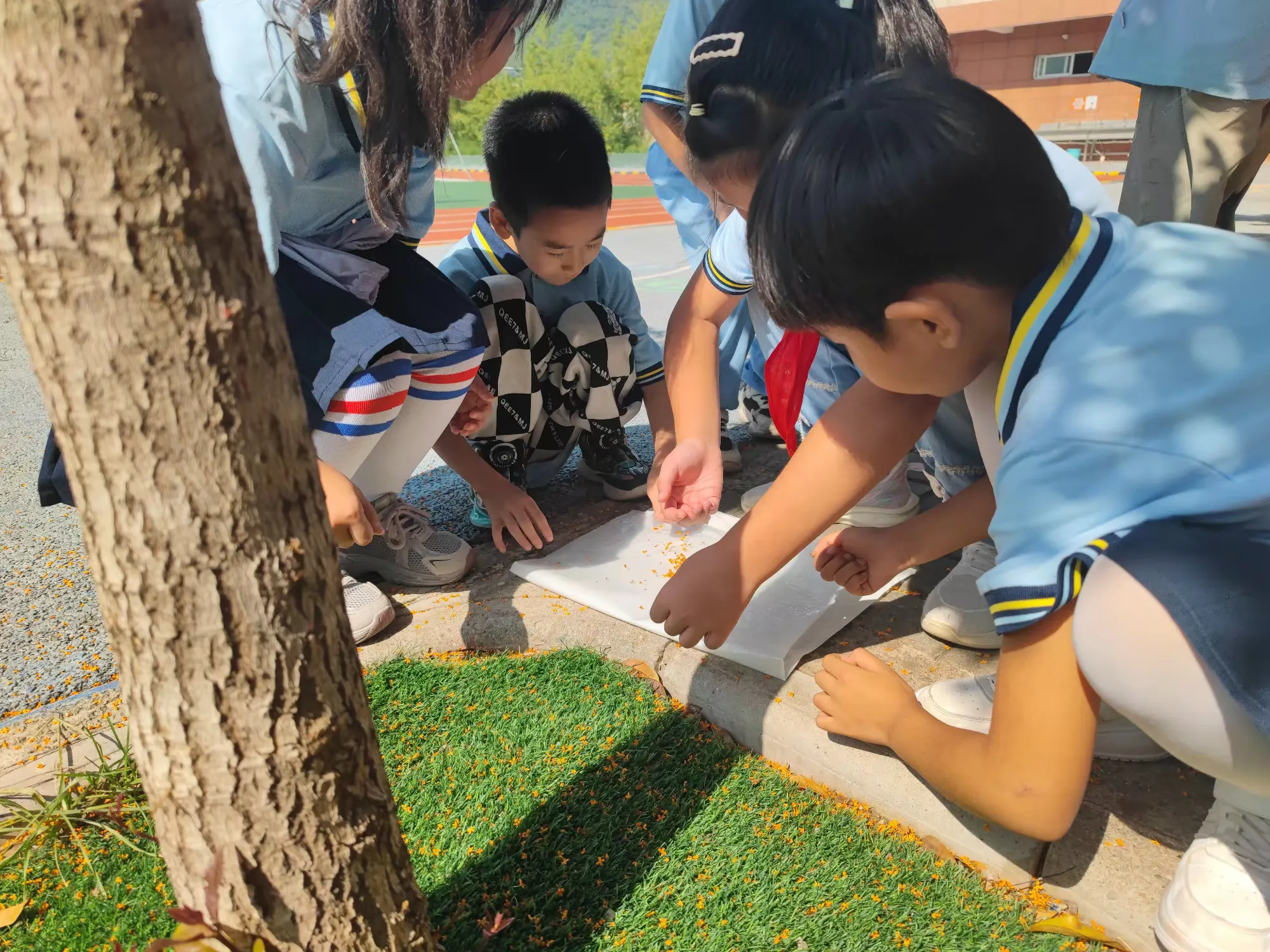 伴随着秋风,桂花徐徐飘落,桂花树下铺了一层厚厚的桂花,同学们兴致勃勃来到树下,一朵、两朵……捡起桂花,时不时闻一闻,哇,好香!老师让学生仔细观察桂花的形状、颜色,同学们兴奋地告诉老师,老师告诉同学们桂花的生长环境、生长过程、用途价值、生长变化以及内部结构,让同学们走进科学的世界探索桂花。