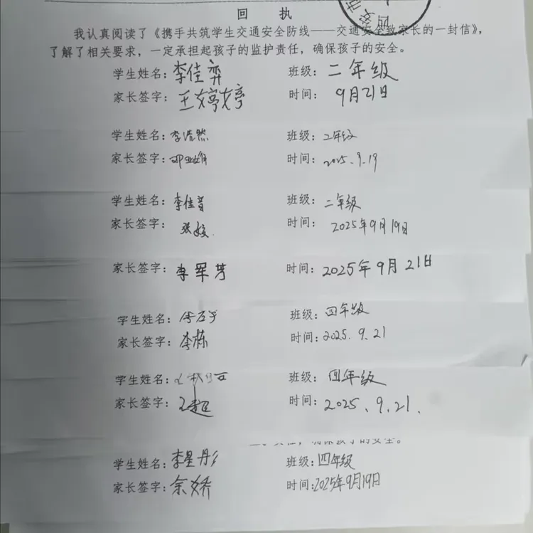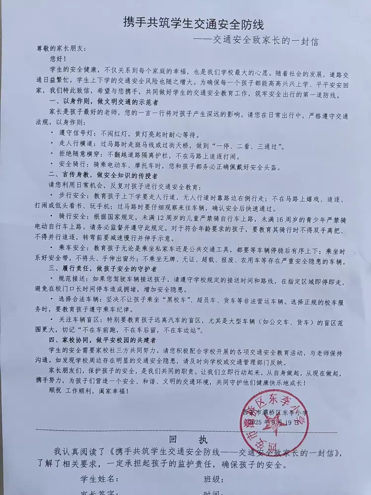 为形成家校协同教育合力,学校向全体学生家长发放《携手共筑学生交通安全防线——交通安全致家长一封信》。信中明确告知家长作为孩子的第一监护人,需以身作则遵守交通规则,同时提醒家长加强对孩子上下学途中的安全监管,还倡议家长与孩子共同学习交通安全知识,通过亲子互动强化孩子的安全意识。此形式有效推动了家校联动,为学生营造了全方位的交通安全教育环境。