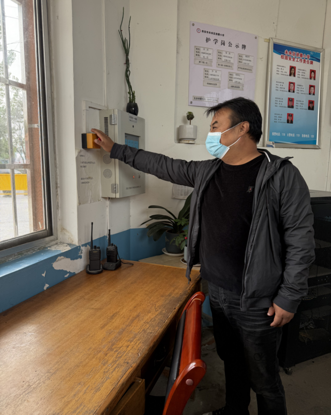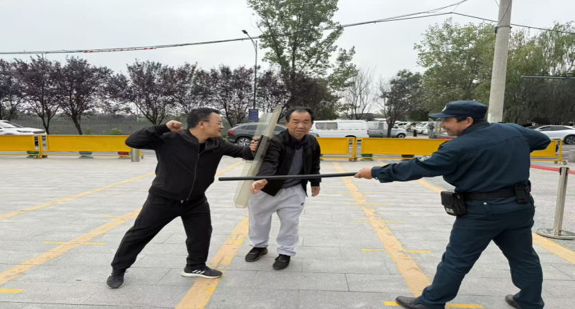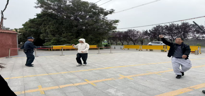上午10时,演练正式开始。两名“歹徒”(由教师扮演)手持仿真器械试图闯入校园,校门口保安立即启动应急响应:手持防暴盾牌、钢叉迅速上前阻拦,后勤主任郑凯同时按下一键报警装置;广播室随即响起急促的警报声,“全体师生请注意,校园内发生紧急情况,请立即启动防恐防暴预案!”