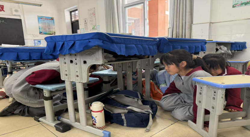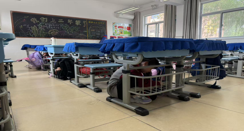 听到警报后,各班教师反应迅速:第一时间关闭教室门窗,用课桌、书包抵住门板;引导学生快速蹲到课桌下方,双手抱头保护头部和颈部,同时提醒大家保持安静,避免发出声响吸引“歹徒”注意。整个过程中,孩子们听从指挥、动作有序,没有出现慌乱哭闹的情况。