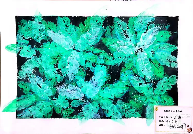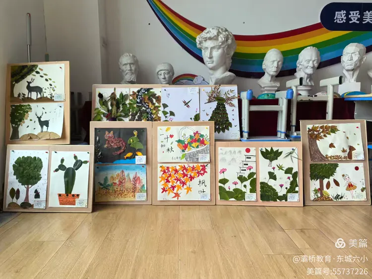 三、四年级学生利用落叶拓印、拼接等方式创作美术作品。