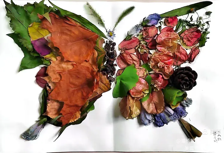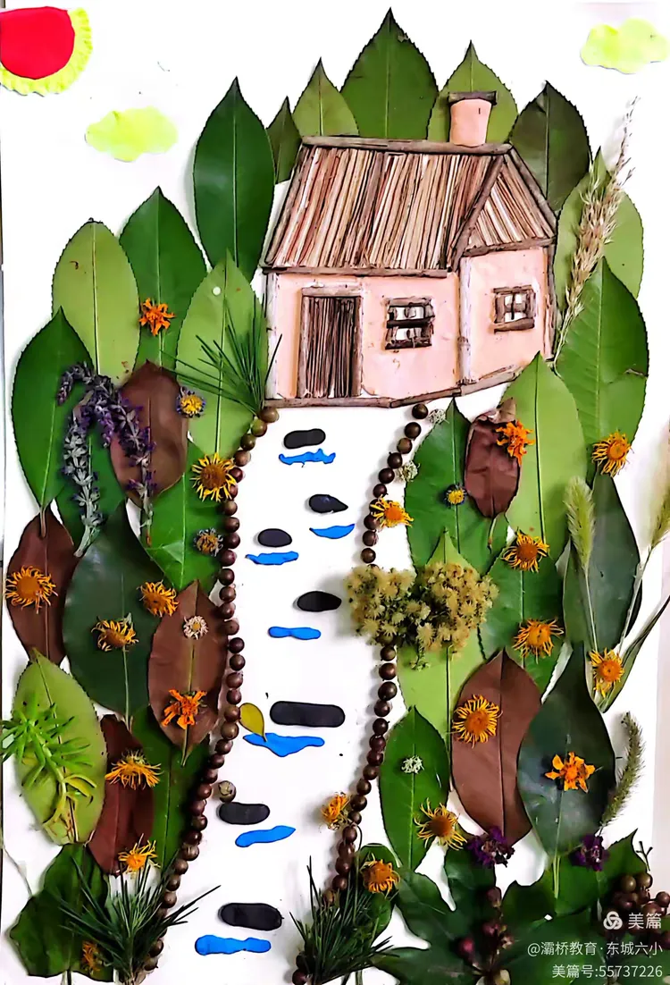 一、二年级学生收集不同颜色的落叶、果实、种子等,制作精美的贴画或标本。
