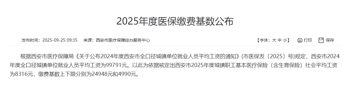 根据西安市医疗保障局《关于公布2024年度西安市全口径城镇单位就业人员平均工资的通知》(市医保发〔2025〕号)规定,西安市2024年度全口径城镇单位就业人员平均工资为99791元。以此为依据核定出西安市2025年度城镇职工基本医疗保险(含生育保险)社会平均工资为8316元,缴费基数上下限分别为24948元和4990元。