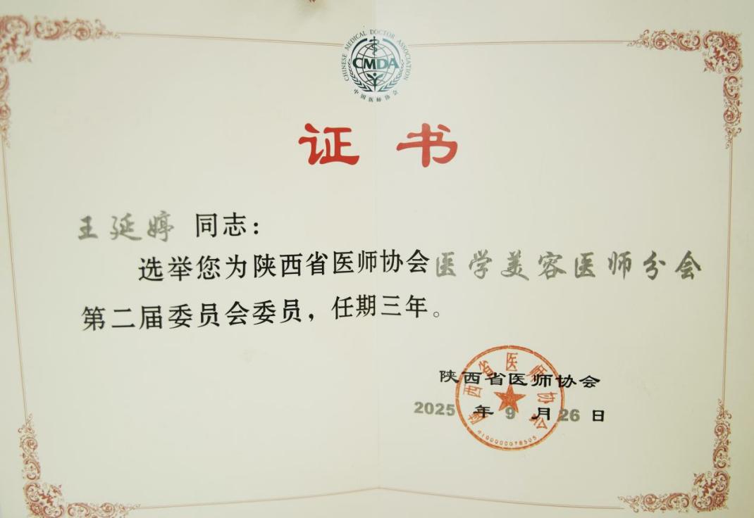 “能够再次当选陕西省医师协会医学美容医师分会第二届委员会委员,我首先要向分会各位同仁的信任与支持致以最诚挚的感谢。这份荣誉不仅是对我个人多年深耕皮肤美容抗衰领域的认可。为皮肤美容抗衰领域的发展增智献力,加强皮肤美容抗衰医师的凝聚力和归属感,共同推动医疗美容行业的健康发展。”王延婷主任表示。