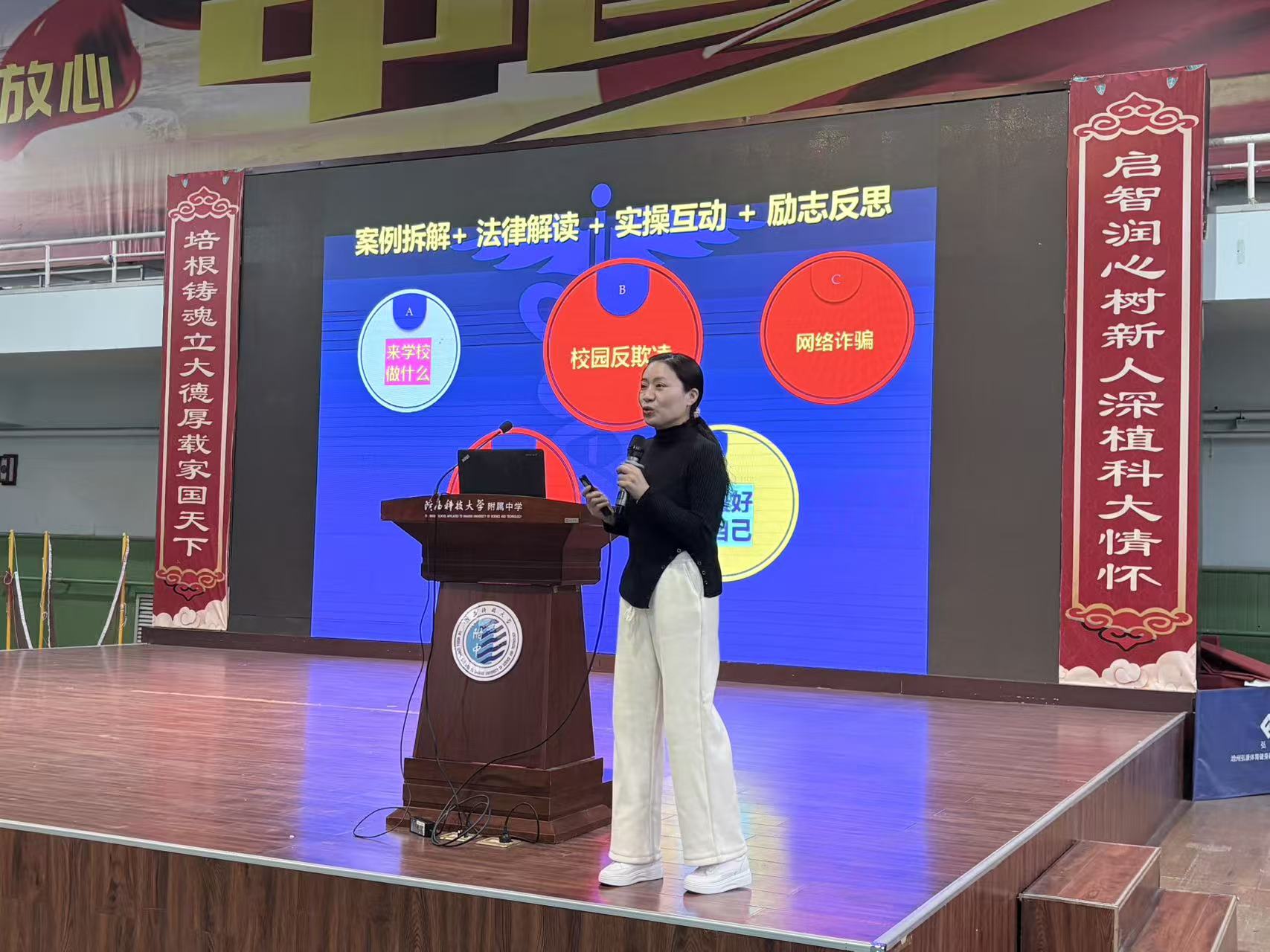 随后,秦直道律师事务所法律顾问王薇聚焦未成年人生活高频风险,以生动鲜活的案例为切入点,围绕“预防校园欺凌”“防范网络诈骗”“警惕不良社会交往”三大核心内容展开讲解。从识别欺凌行为的隐蔽表现,到拆解网络诈骗的常见套路,再到分析不良交往的潜在危害,她用同学们听得懂、易接受的语言,将法律知识转化为“护身指南”,带来一堂干货十足的法治课。