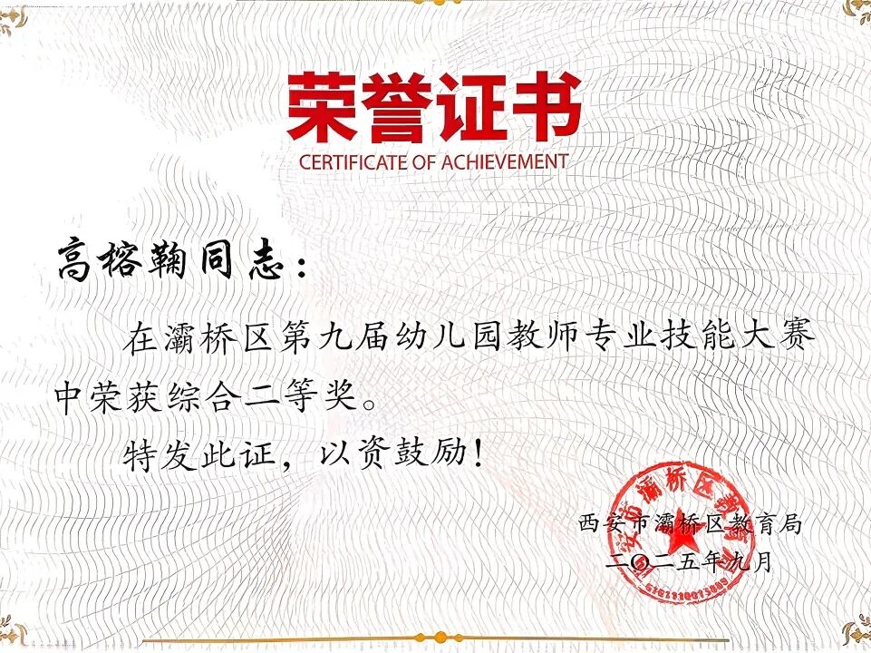 日前,西安市灞桥区席王街道中心幼儿园高榕鞠老师在灞桥区第九届幼儿园教师专业技能大赛中喜获二等奖。