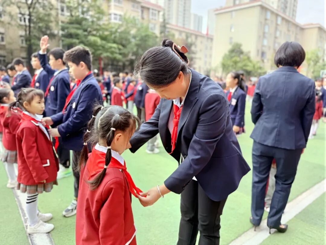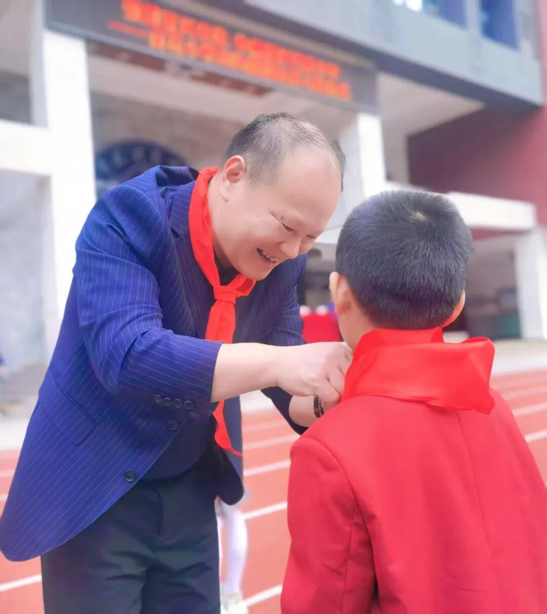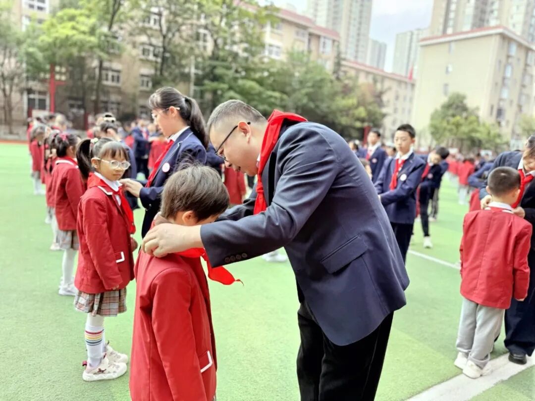 最激动人心的时刻到来——佩戴红领巾。宣读完入队决定和名单后,在《红领巾飘起来》的动人旋律中,王均刚校长等行政、中队辅导员老师以及六年级的优秀队员代表共同为新队员佩戴上鲜艳的红领巾。当行政班子及老师们弯腰为对应班级第一排同学细心系上红领巾时,当六年级哥哥姐姐熟练地为新队员整理衣领时,红色的荣耀与温暖的责任感在无声中传递。这一刻,新队员脸上洋溢着自豪与喜悦,胸前飘扬的红领巾成为他们成长的崭新标记。