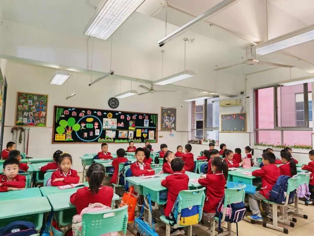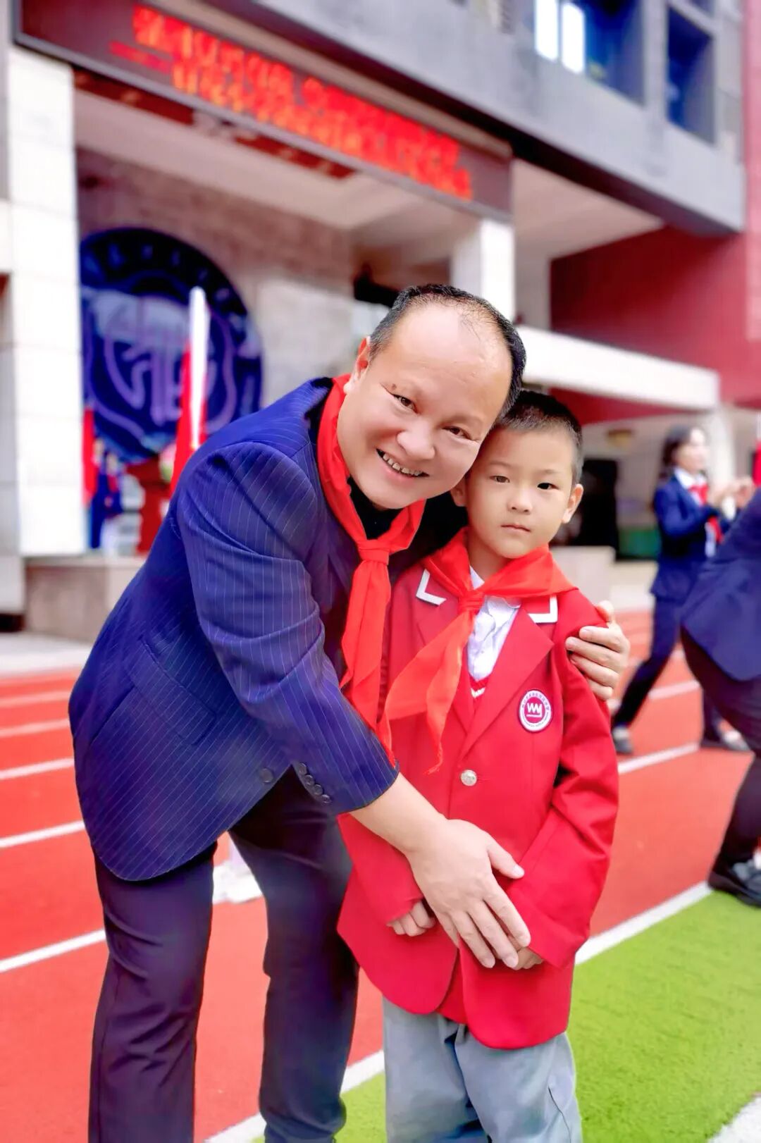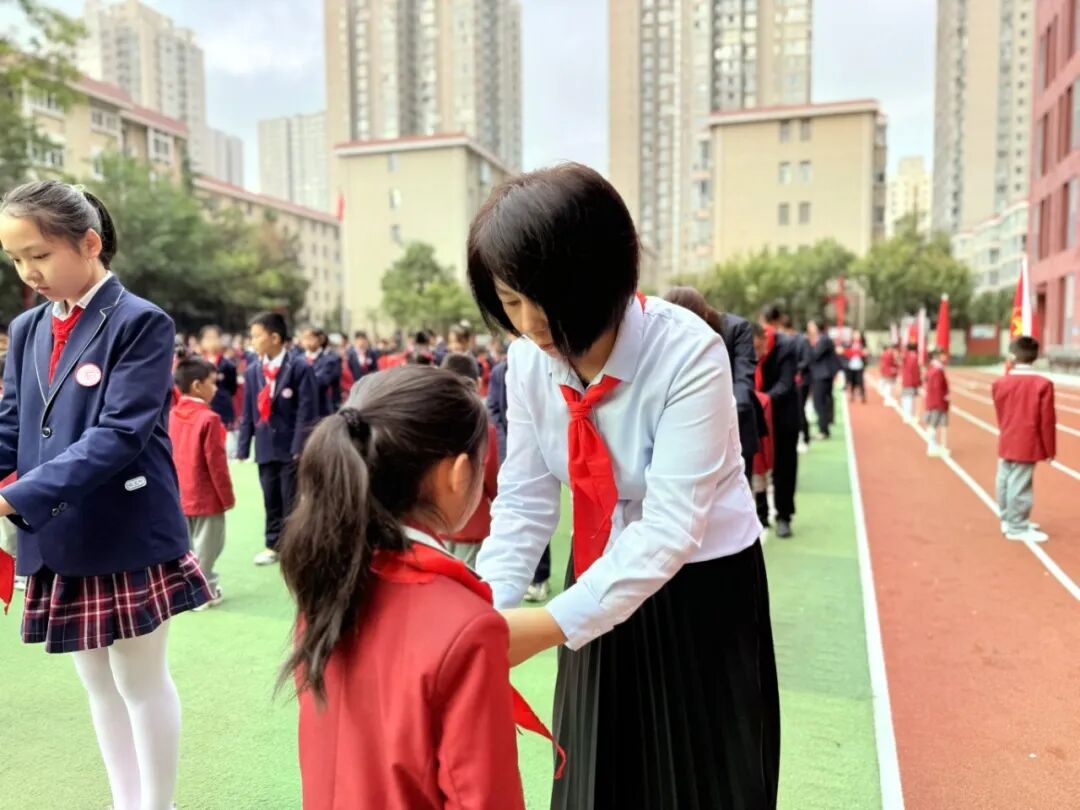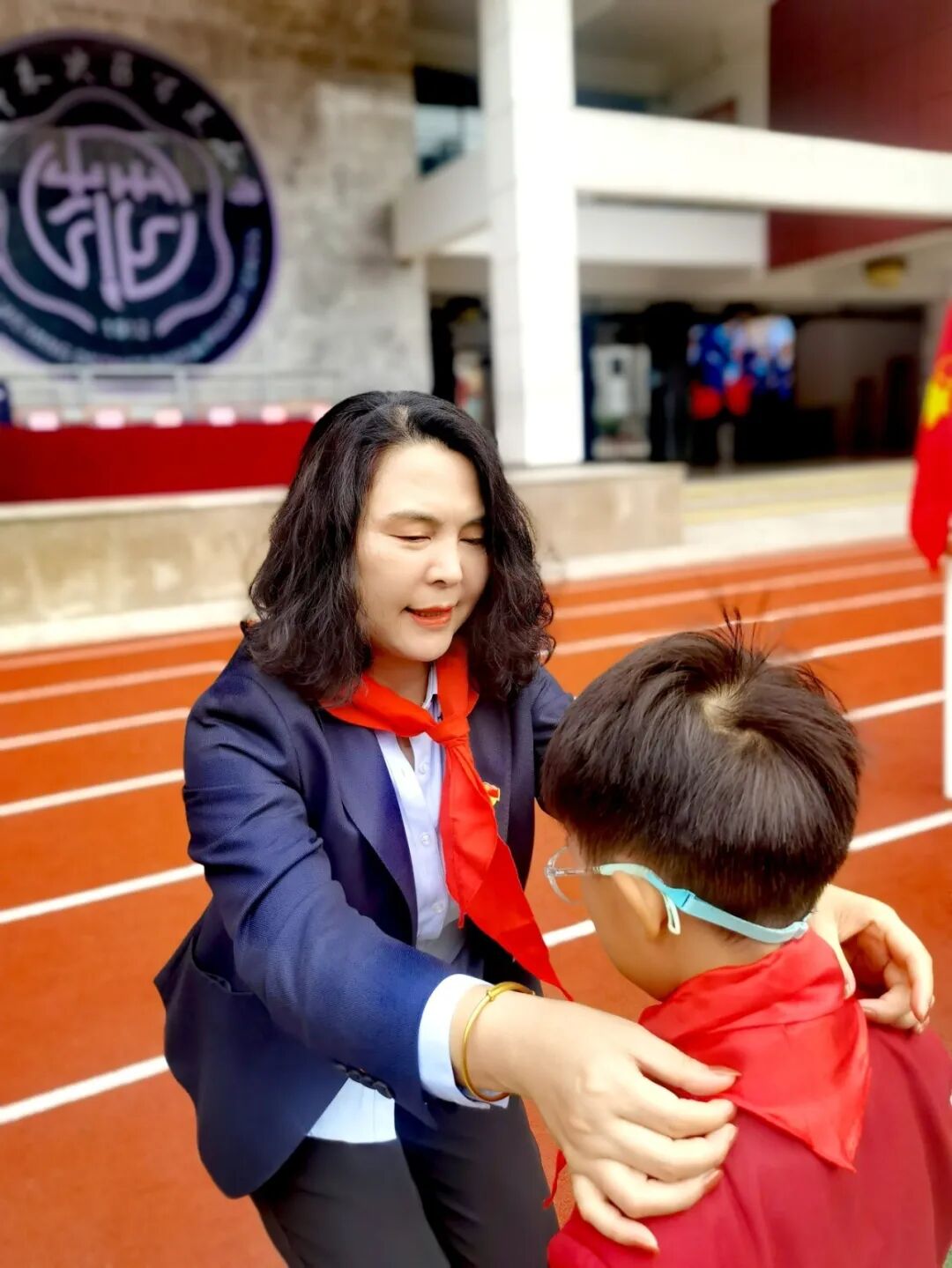 最激动人心的时刻到来——佩戴红领巾。宣读完入队决定和名单后,在《红领巾飘起来》的动人旋律中,王均刚校长等行政、中队辅导员老师以及六年级的优秀队员代表共同为新队员佩戴上鲜艳的红领巾。当行政班子及老师们弯腰为对应班级第一排同学细心系上红领巾时,当六年级哥哥姐姐熟练地为新队员整理衣领时,红色的荣耀与温暖的责任感在无声中传递。这一刻,新队员脸上洋溢着自豪与喜悦,胸前飘扬的红领巾成为他们成长的崭新标记。