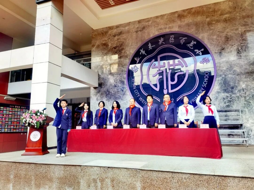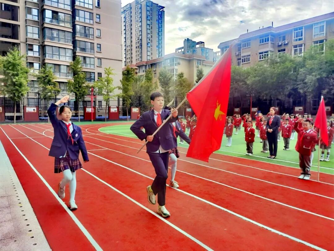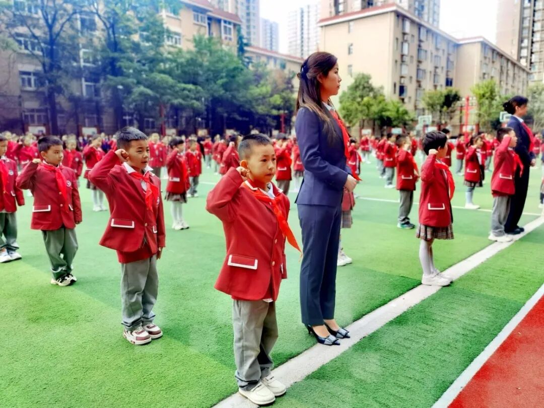 仪式在激昂的出旗曲中正式开始,旗手步伐坚定,全体少先队员敬队礼,目光如炬。