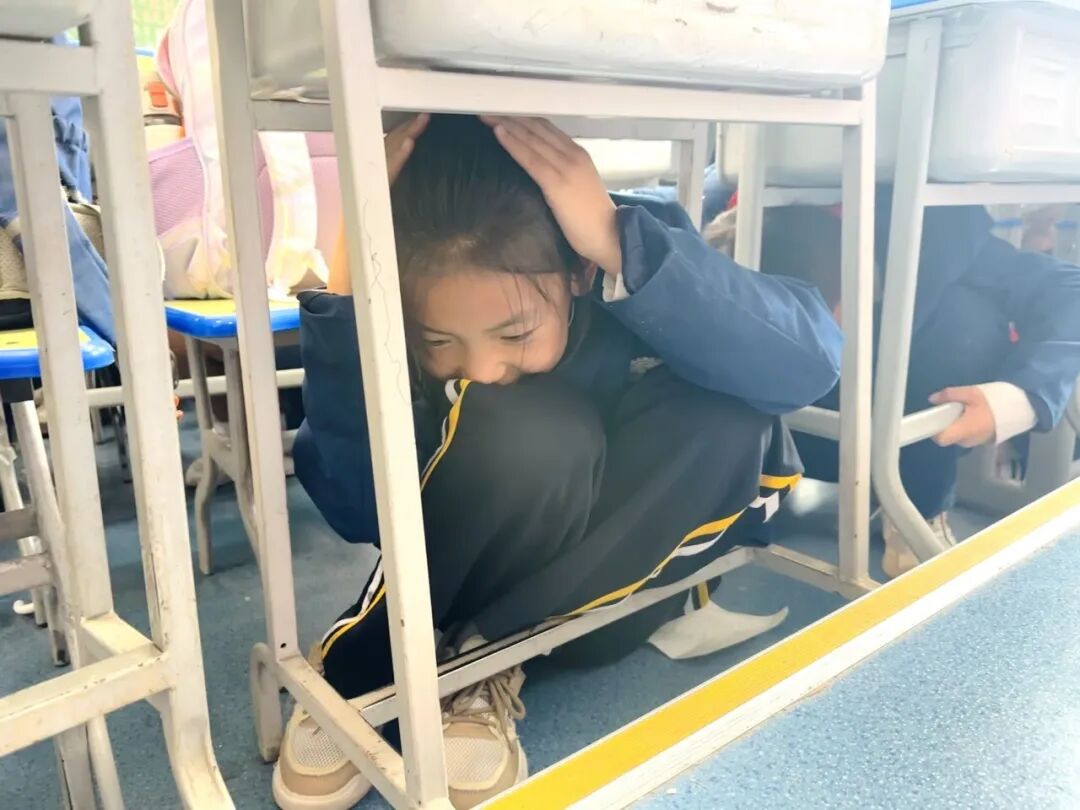 教室内,班主任与搭班老师反应迅速,带领学生们“关门窗、顶桌椅、静躲避”,一系列动作有条不紊,瞬间构建起室内安全屏障。