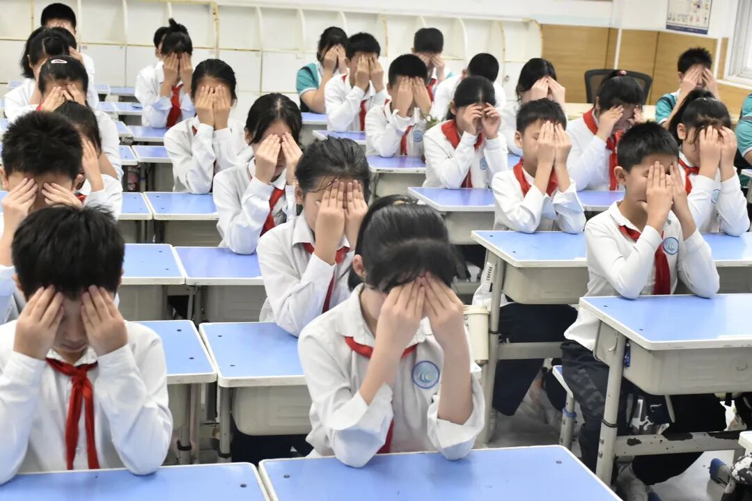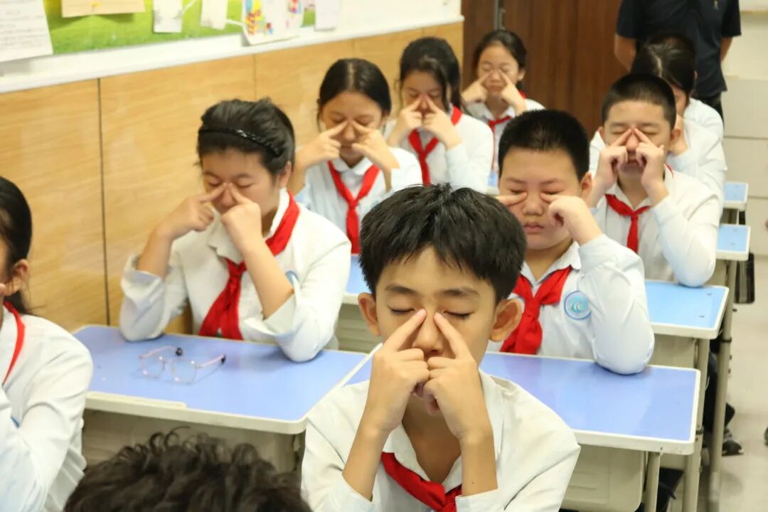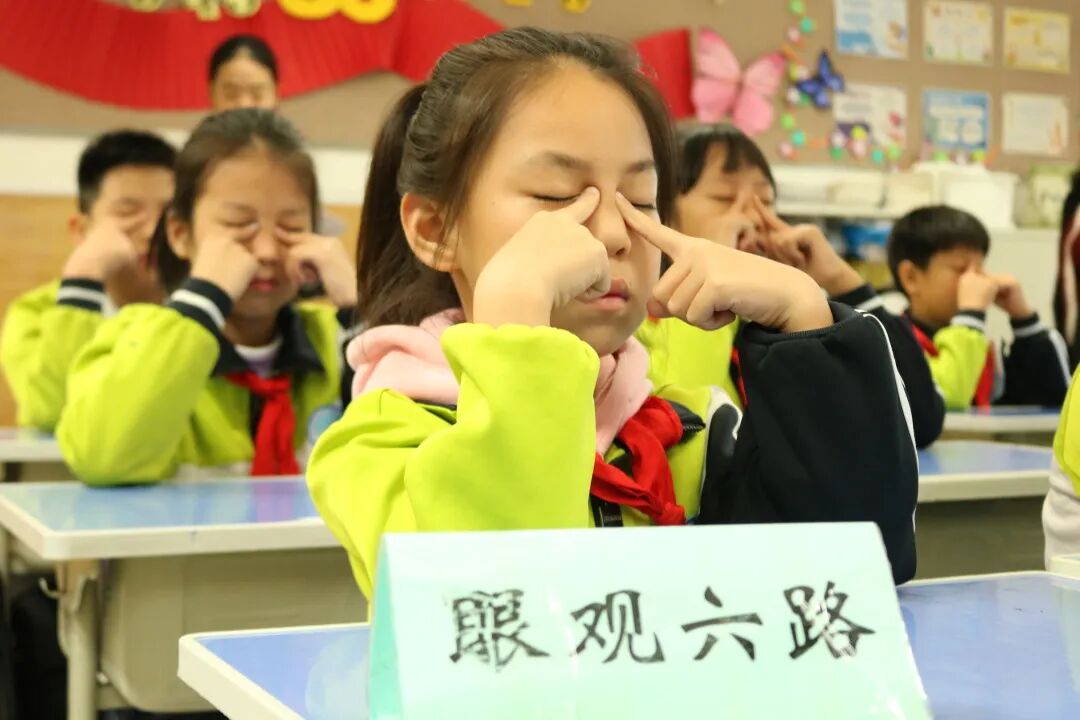 比赛开始,各班教室瞬间化身为整齐有序的 “赛场”。从沉稳自信的六年级到天真烂漫的一年级,学生们按照班级顺序依次 “登场”。教室内,同学们身姿挺拔地端坐在座位上,伴随着舒缓轻柔的音乐缓缓响起,他们缓缓闭上双眼,神情专注而认真。一双双稚嫩的小手如同精准的 “导航仪”,稳稳落在睛明穴、四白穴、太阳穴等眼部穴位上,揉按动作规范标准,节奏与音乐完美契合,用力恰到好处,尽显平日训练的扎实功底。