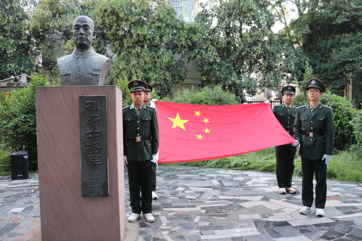 学生代表缓步走向孙蔚如将军雕像,敬献花篮,学校负责人仔细整理花篮缎带。一束束鲜花,寄托着全校师生对将军的深切缅怀,也象征着红色基因的代代相传。