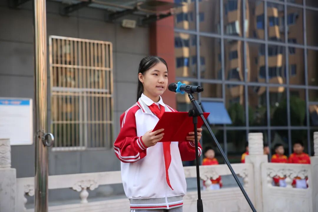 六(5)班欧阳贤蓉作为学生代表进行发言,她向全体新少年发出倡议:争做遵纪守法的示范者、文明校园的维护者、友爱相处的践行者,展现新少年积极向上的精神风貌。