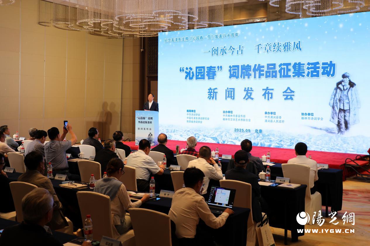 阳光讯(记者 高小雨 通讯员 李涛)9月30日,纪念毛泽东主席《沁园春・雪》发表八十周年“一阕承今古 千章续雅风——‘沁园春’词牌作品征集活动”新闻发布会在北京举行。中华诗词学会会长、国家行政学院原副院长周文彰,中国毛泽东诗词研究会会长陈晋出席并讲话,榆林市委常委、宣传部部长徐刚出席并致辞。中华诗词学会常务副会长林峰主持发布会。