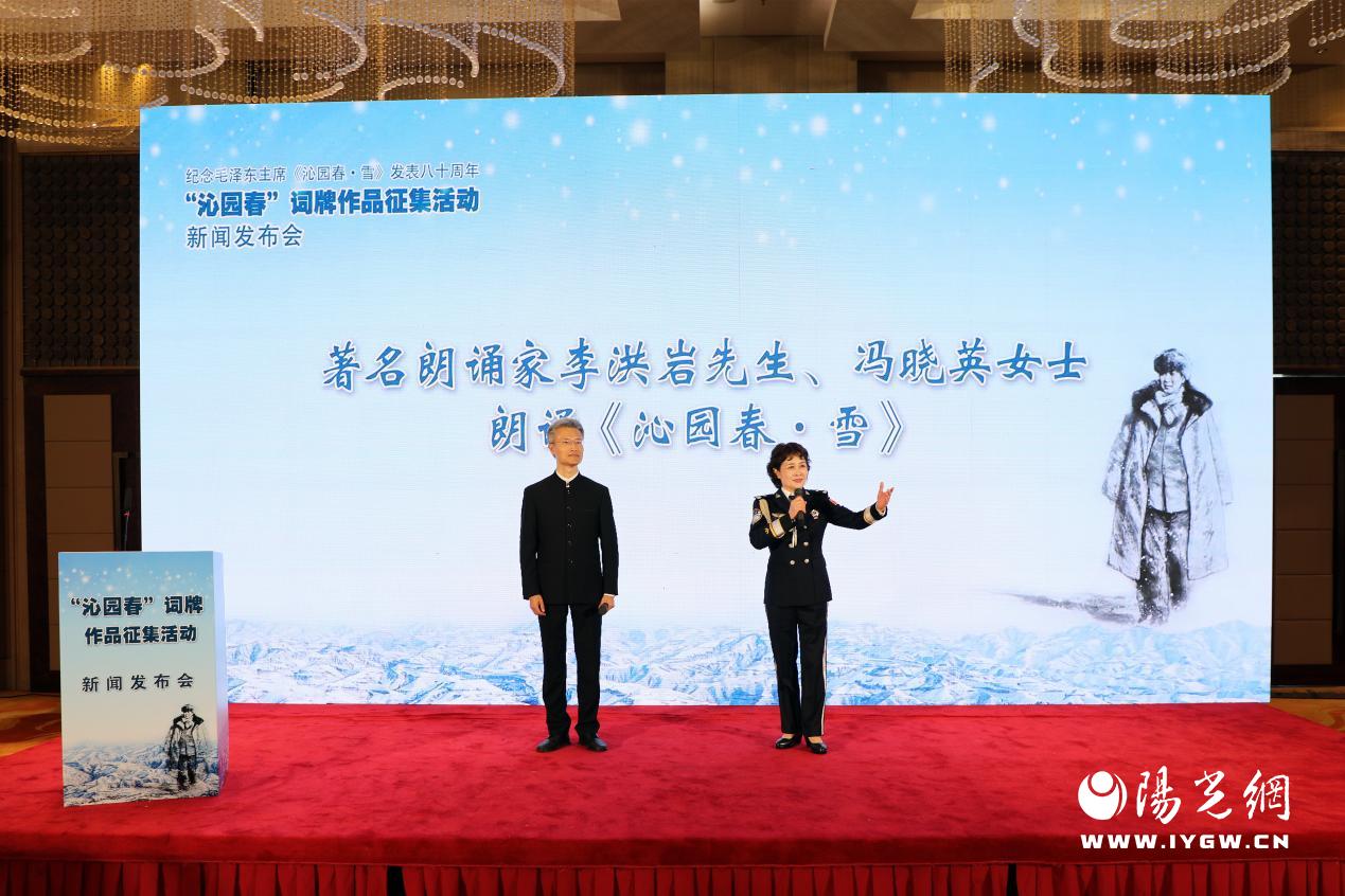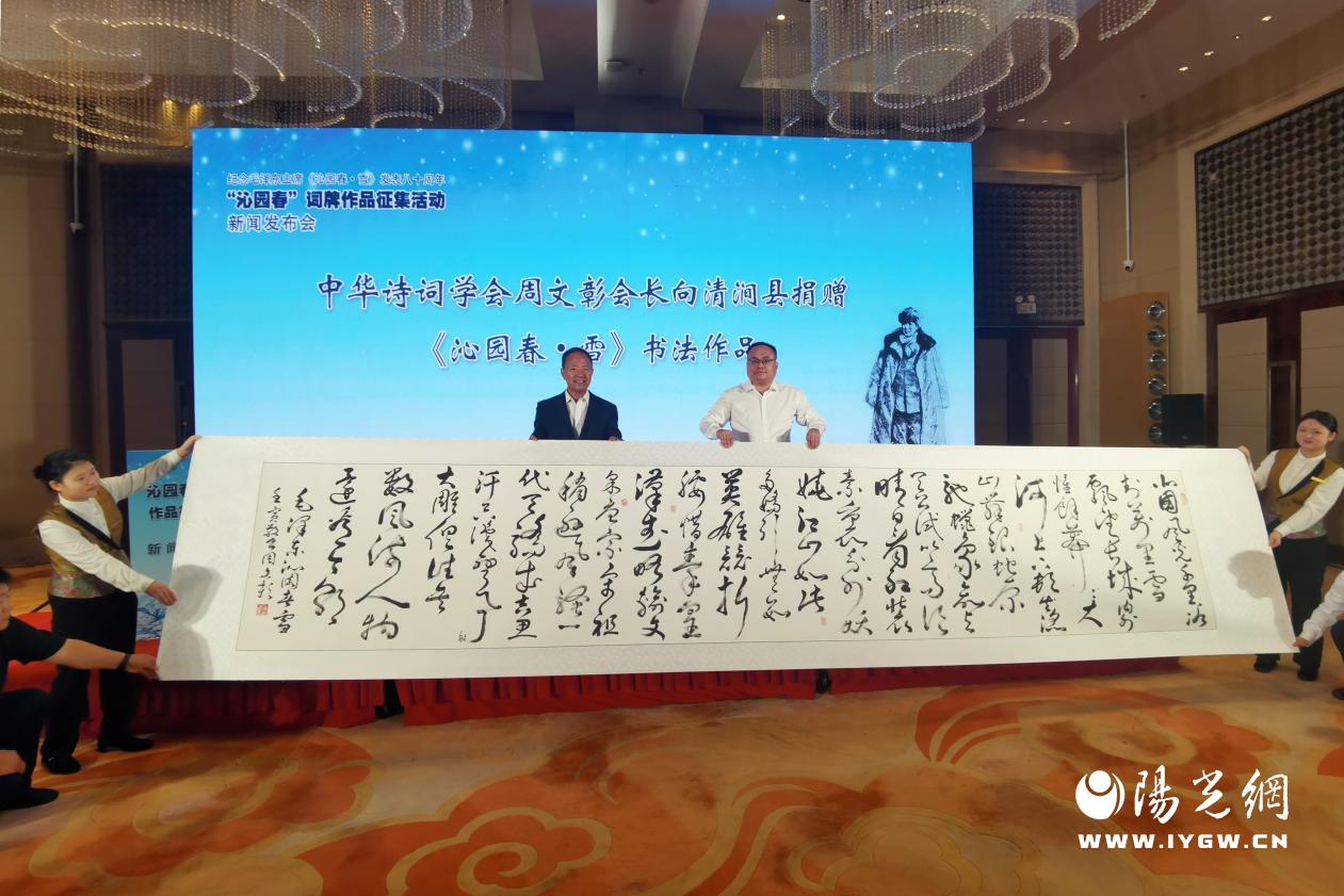 发布会上,还宣读了《“沁园春”词牌作品征集启事》,播放了清涧县专题宣传片,中华诗词学会向清涧县捐赠了《沁园春·雪》书法作品,著名朗诵家李洪岩、冯晓英共同朗诵了《沁园春·雪》。