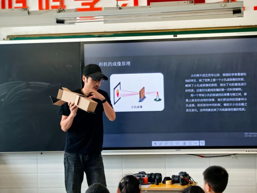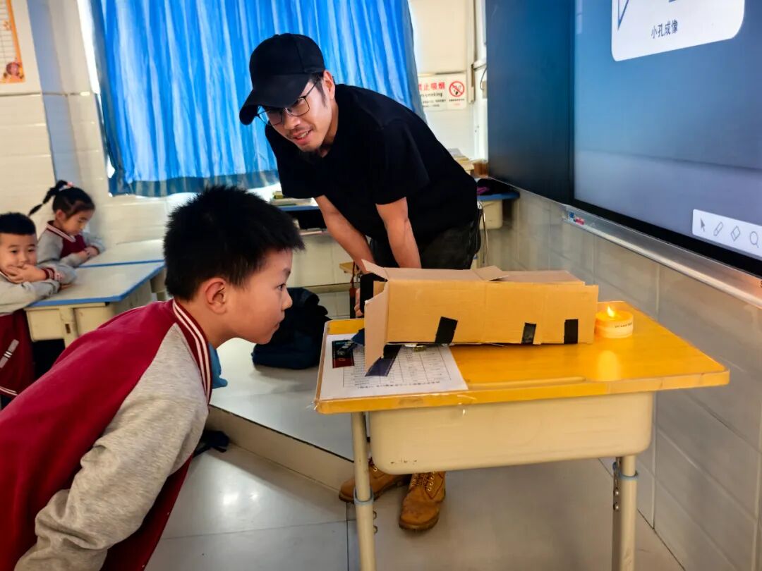 二年级二班家长为学生带来一堂主题为“照片是怎样拍出来的?小孔成像原理”的科学课。相机镜头如同“小孔”,景物反射的光沿直线穿过,在相机内部感光元件上形成倒立的像,经过处理后,一张清晰的照片就诞生啦。