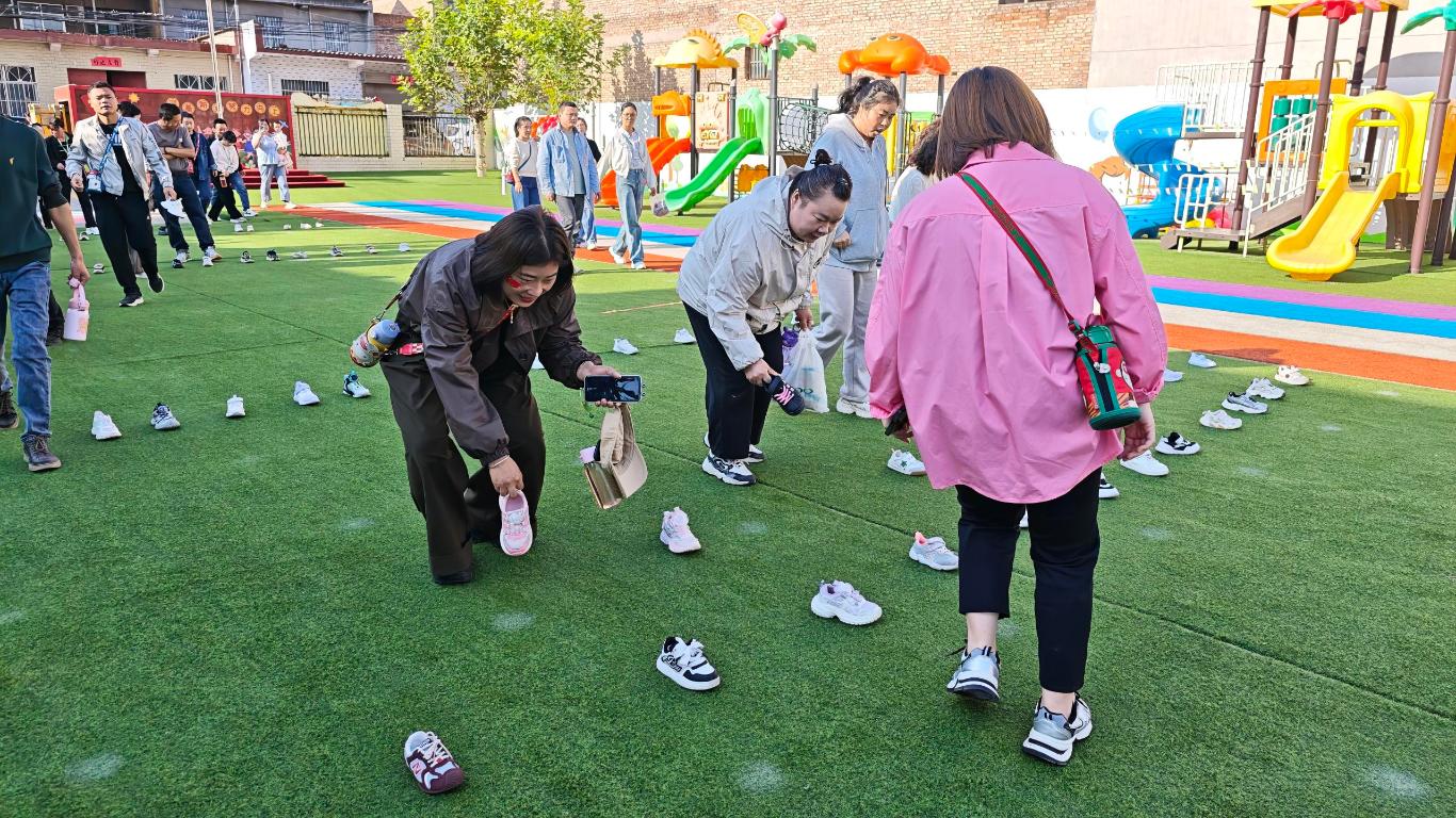 这是一场考验默契的亲子小游戏。操场上,孩子们的鞋子按班级排好了队。家长们入园后,纷纷化身"侦探",在众多鞋子中寻找自己孩子的那一只。