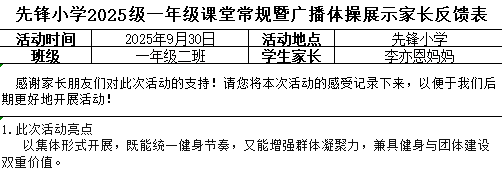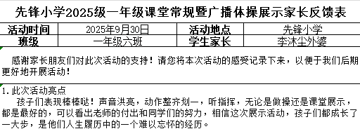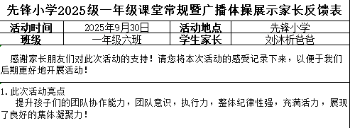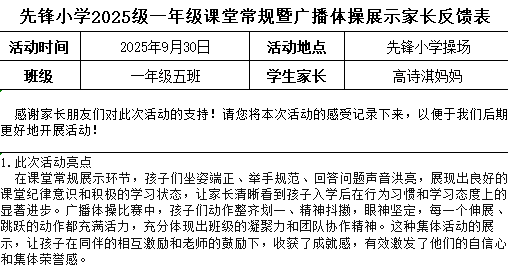 此次展示活动不仅是对一年级新生入学月余训练成果的全面检验,更是学校“向常规管理、向课堂40分钟要质量”管理理念的生动实践。通过课堂常规与体育技能的结合展示,先锋的小萌新们进一步强化了规则意识与集体荣誉感,家长代表们也在现场直观感受到学校的教学管理与育人温度。(来源 西安市未央区先锋小学)