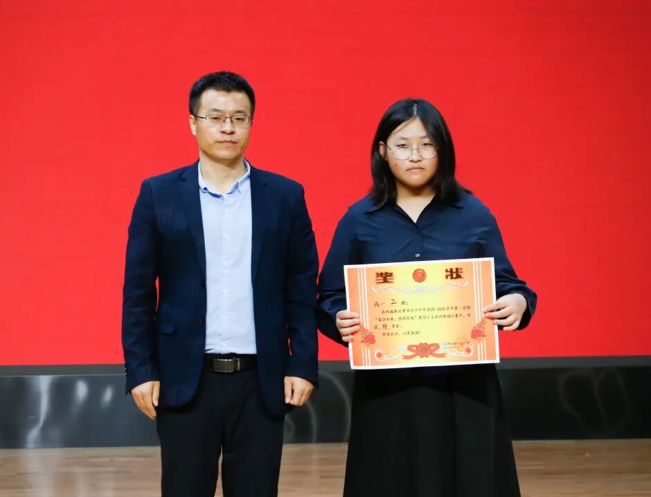 总校长唐才畏在致辞中为同学们上了一堂生动的爱国主义教育课。他围绕“铭记历史、肩负责任、接续奋斗”的主题娓娓道来。唐校长深情回顾了新中国76年来从站起来、富起来到强起来的伟大历程,通过讲述国家发展中的重大成就与感人事迹,特别是不同时期青年人的奉献故事,深刻阐释了爱国主义的时代内涵。他强调,爱国不是空洞的口号,而是要融入日常学习和行动中。最后,他勉励全体同学:作为新时代青年,要珍惜时光,学好本领,将个人理想与国家发展紧密结合,用实际行动践行“强国有我”的铮铮誓言,为实现中华民族伟大复兴贡献青春力量。
