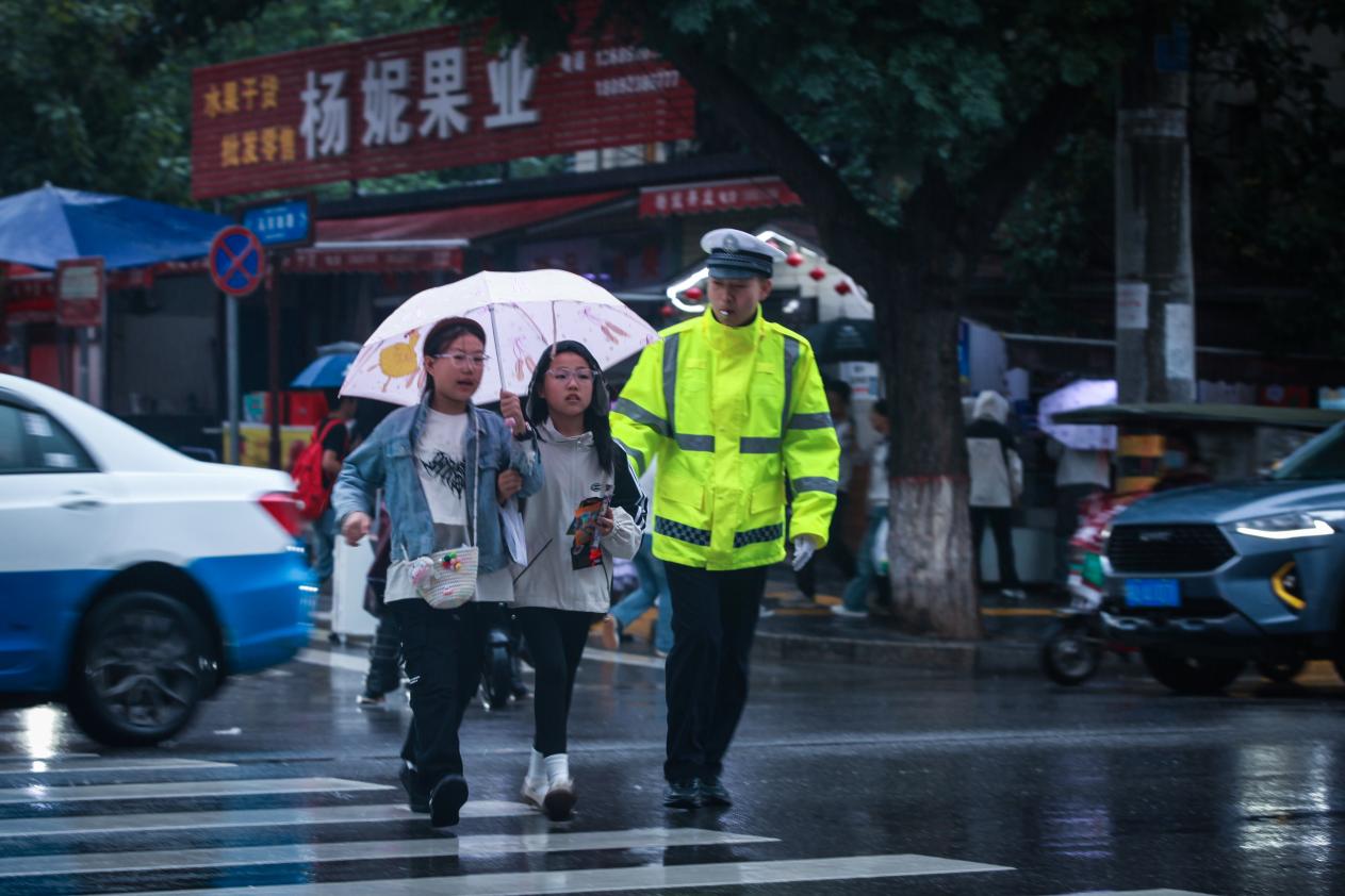 从帮助受困车辆推车,到为电动车张贴反光贴;从解答群众咨询,到处理轻微交通事故,民警们在雨中用实际行动传递着公安温度。雨水打湿了警服,模糊了镜片,却丝毫没有动摇他们的坚守,那抹穿梭在雨幕中的“荧光绿”,成为群众眼中最温暖的“平安符号”。