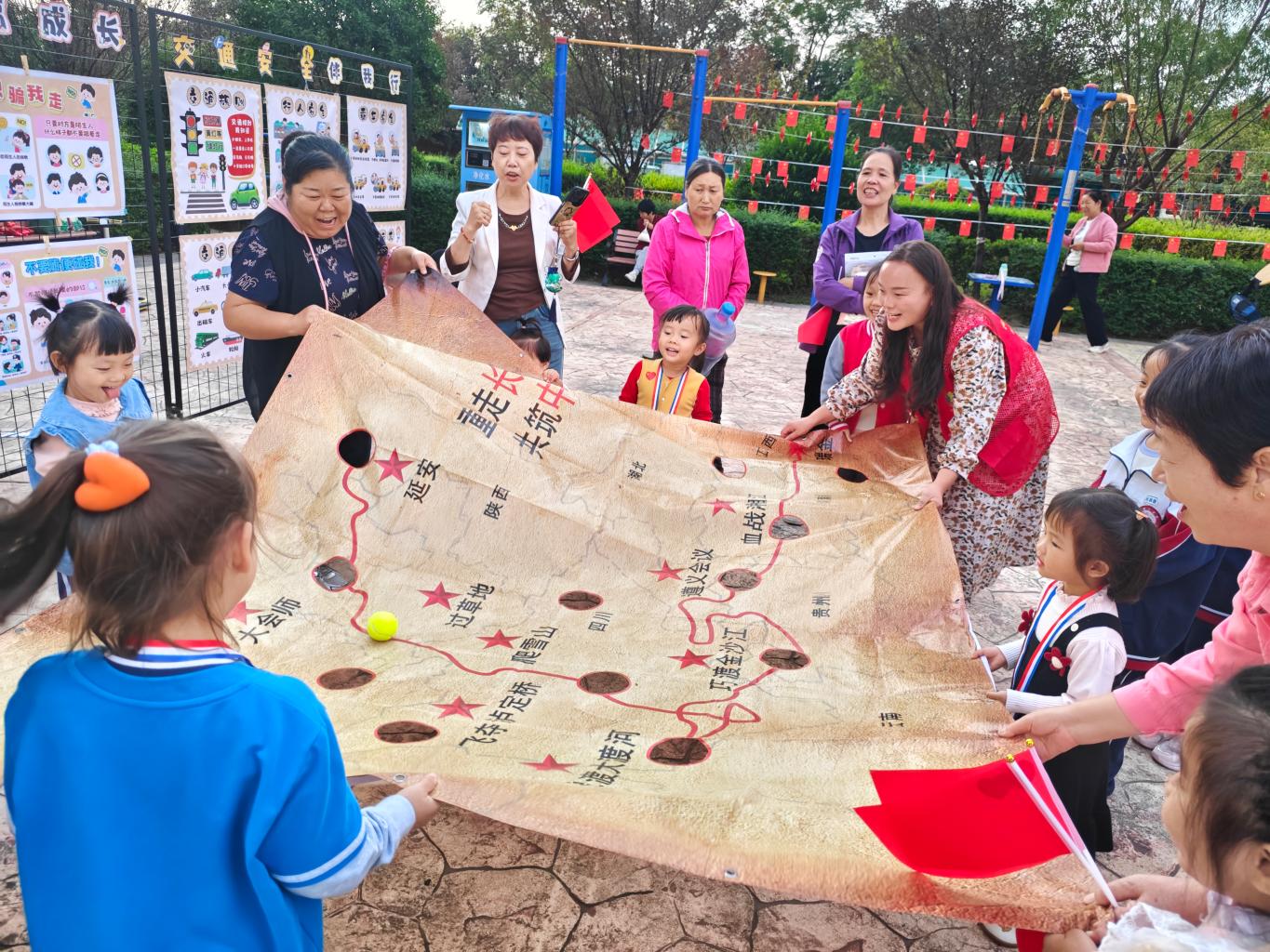“重走长征路”游戏区前,孩子们在家长和志愿者的带领下踊跃参与。听着志愿者讲述长征路上的英雄故事,“原来红军叔叔打仗这么辛苦,我们现在的幸福生活都是他们换来的。”一年级同学吕泽慧说。