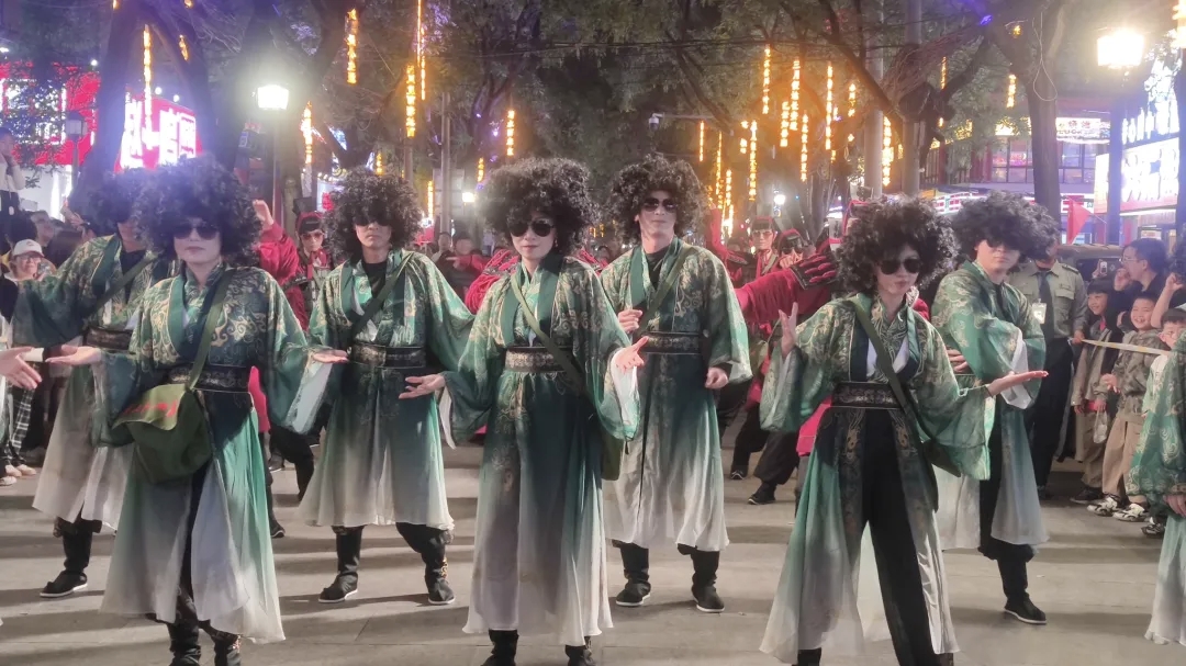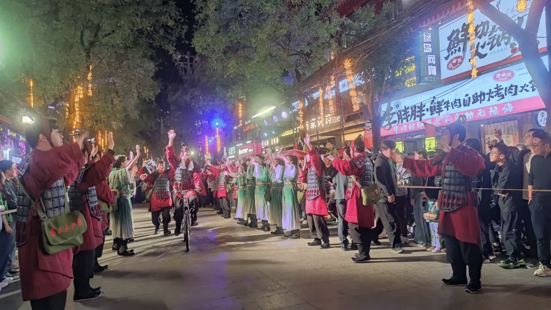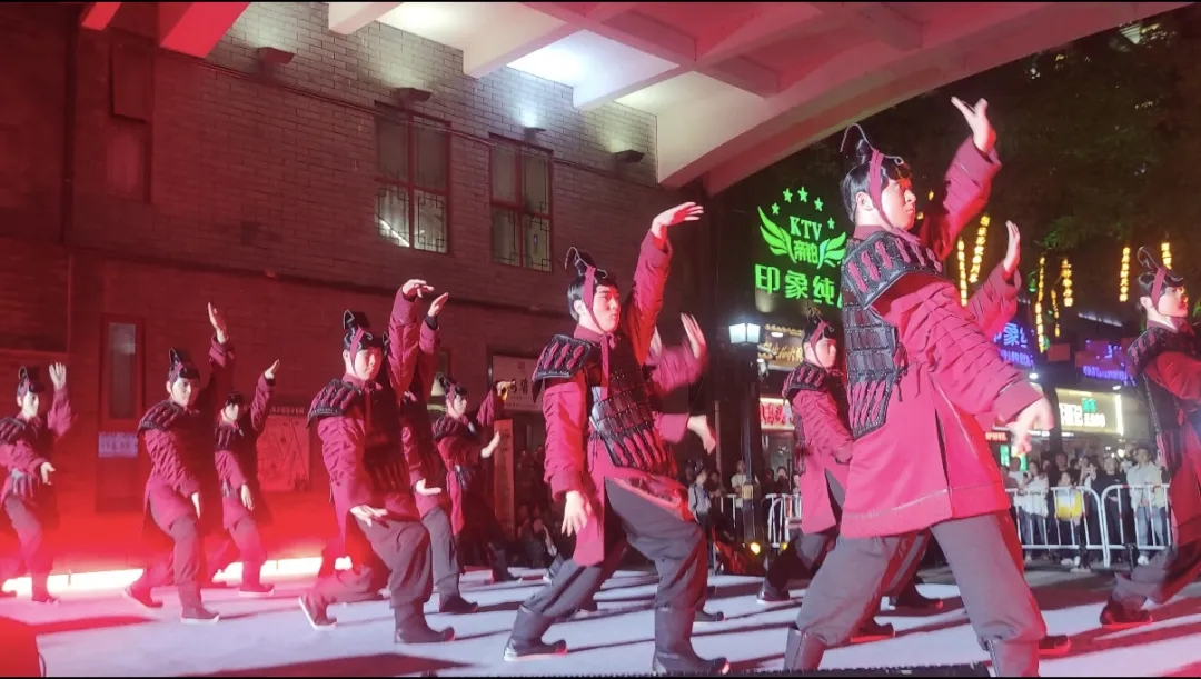 晚7时,“俑动渭城”快闪巡游拉开序幕。30名身着秦俑战甲的舞者组成整齐方阵,铠甲在阳光下泛着沉稳光泽,步伐铿锵间自带历史厚重感。他们缓缓前行,身后的场景随舞步流转,从60年代的红砖瓦舍、70年代的自行车流,到00年代的霓虹闪烁,秦俑战甲与时代印记的碰撞,生动诠释着秦人坚韧不拔、勇往直前的精神在岁月中始终鲜活。