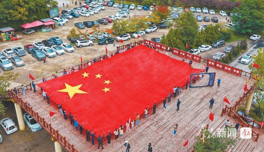 10月2日,游客在铜川市耀州区薛家寨景区红军桥共同展开巨幅国旗,祝福祖国繁荣昌盛。 受访单位供图