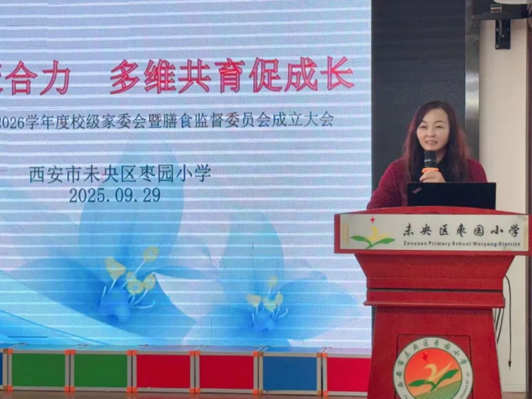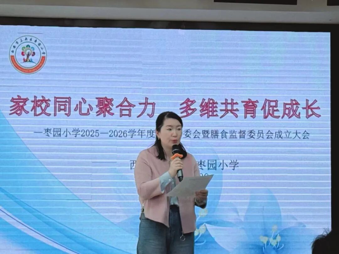 为进一步深化家校合作,强化家校协同育人效能,营造家校社三位一体的全环境育人环境,2025年9月29日,西安市未央区枣园小学举行了2025-2026学年度校级家委会暨膳食委员会成立大会。本次会议以“家校同心聚合力,多维共育促成长”为主题,学校全体行政人员、各班家委会主任、副主任及委员齐聚一堂,共同开启新学期家校共育的新篇章。