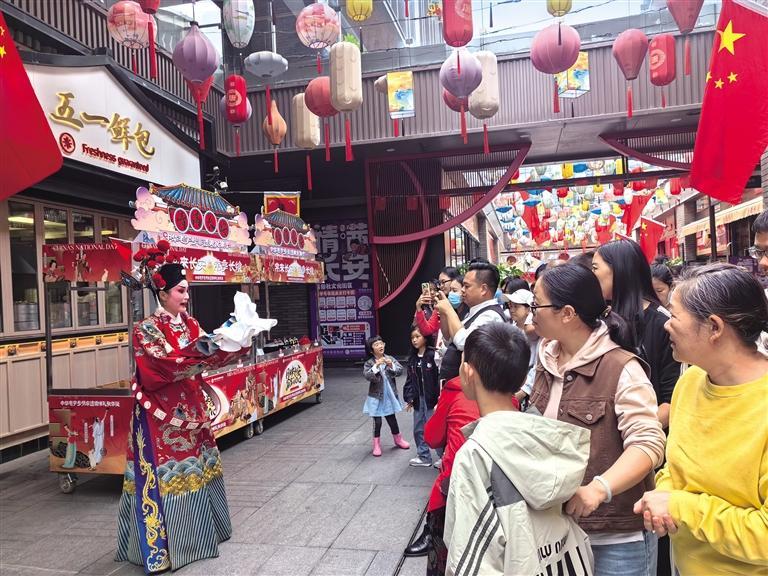 10月3日,在易俗社文化街区,秦腔演员为游客表演经典唱段。